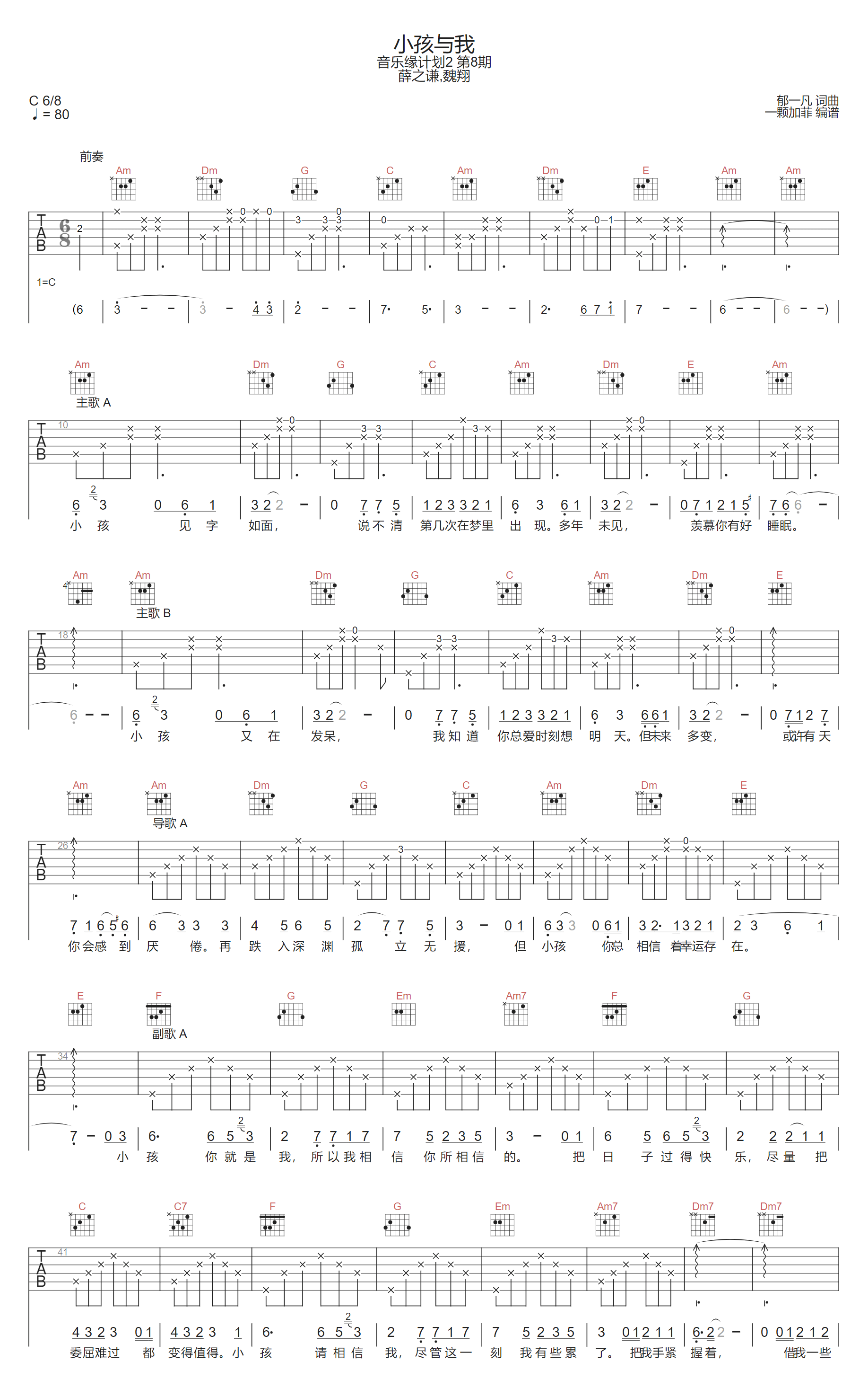 薛之谦与魏翔合唱的《小孩与我》,C 调原版弹唱谱采用 4/4 拍,速度 76BPM,无需变调夹即可贴合原曲温柔质感。核心和弦走向为 C-Am-F-G,编配简洁不花哨,契合歌曲治愈又伤感的基调。
