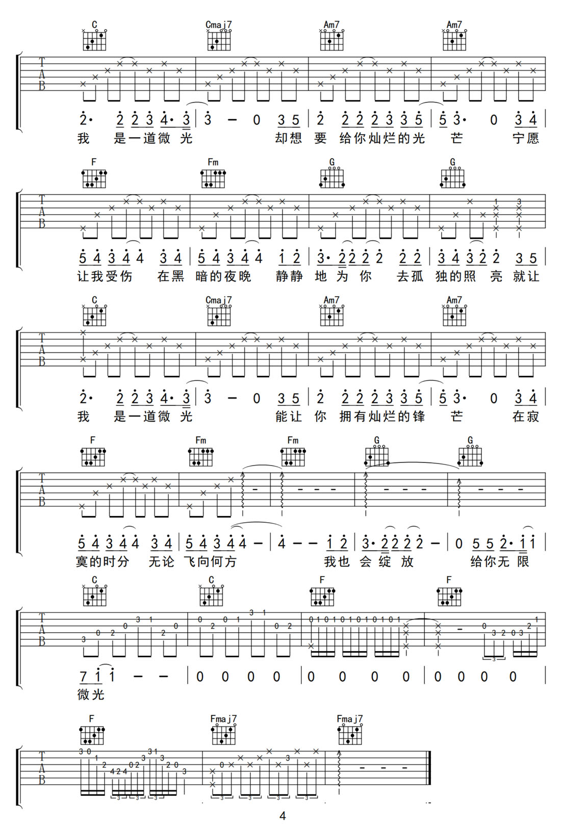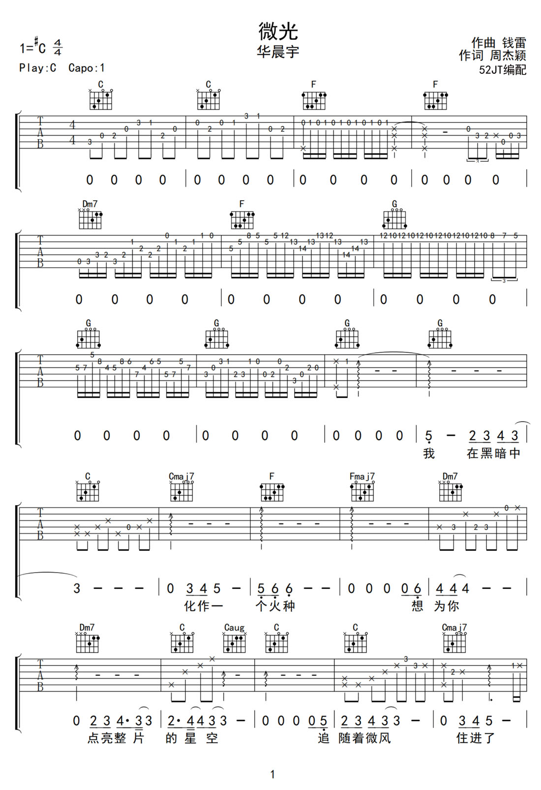 华晨宇《微光》C 调原版弹唱谱,原调 C#,变调夹夹 1 品还原原调,4/4 拍,速度约 72BPM。核心和弦 C - Am - F - G,主歌用分解和弦铺底,副歌轻扫弦递进情绪,契合歌曲温暖又坚韧的基调。