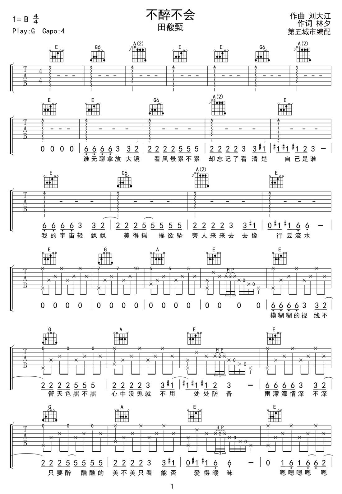 田馥甄《不醉不会》吉他谱_G调扫弦版弹唱谱-图1