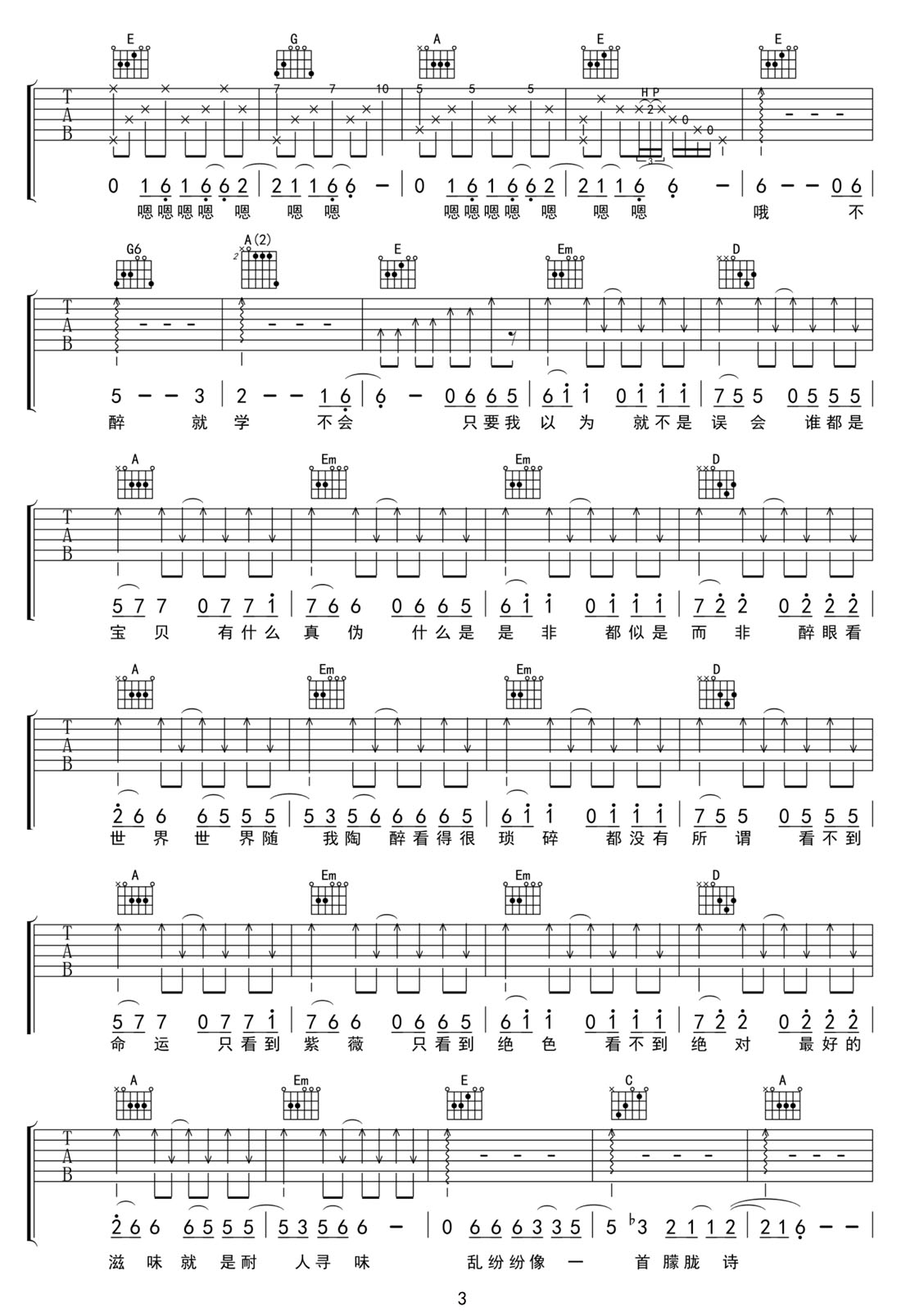 田馥甄《不醉不会》吉他谱_G调扫弦版弹唱谱-图3