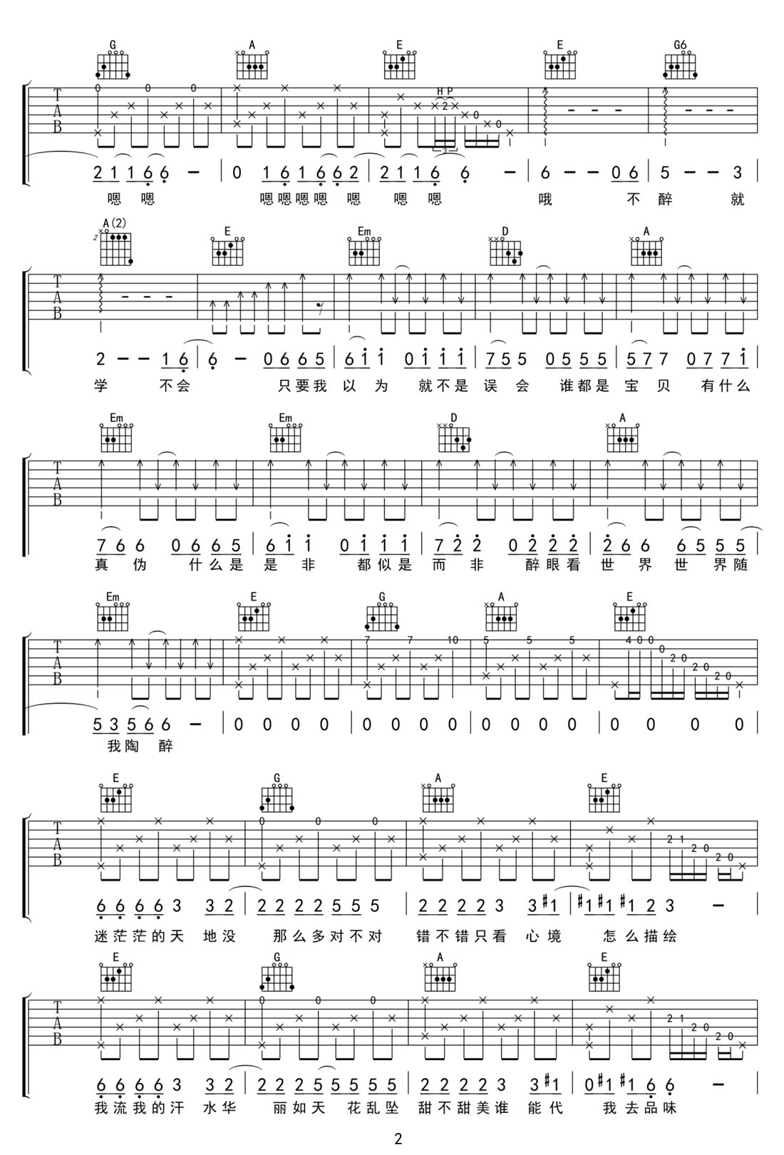 田馥甄《不醉不会》吉他谱_G调扫弦版弹唱谱-图2
