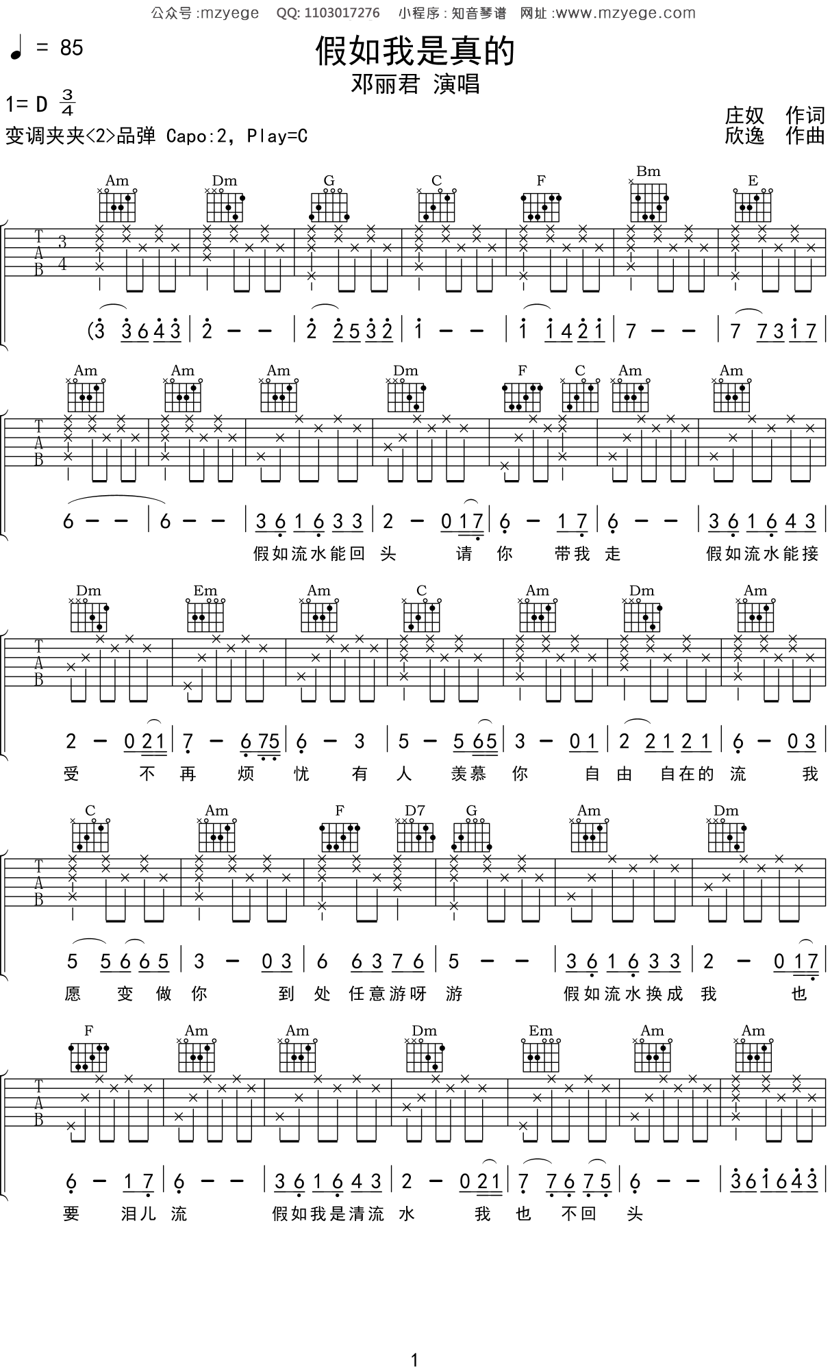 邓丽君《假如我是真的》 C调 吉他弹唱谱图片-图1