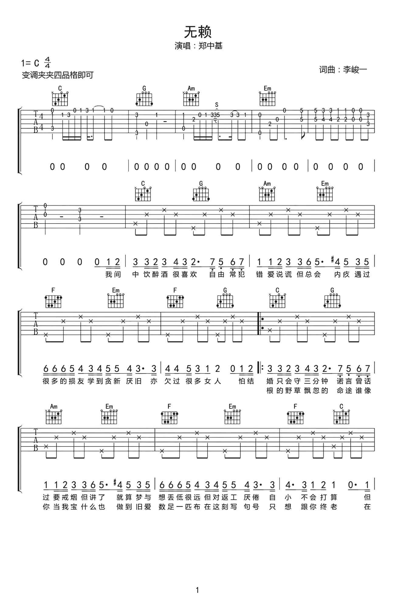郑中基《无赖》吉他谱_C调 原版吉他弹唱谱(图文)-图1