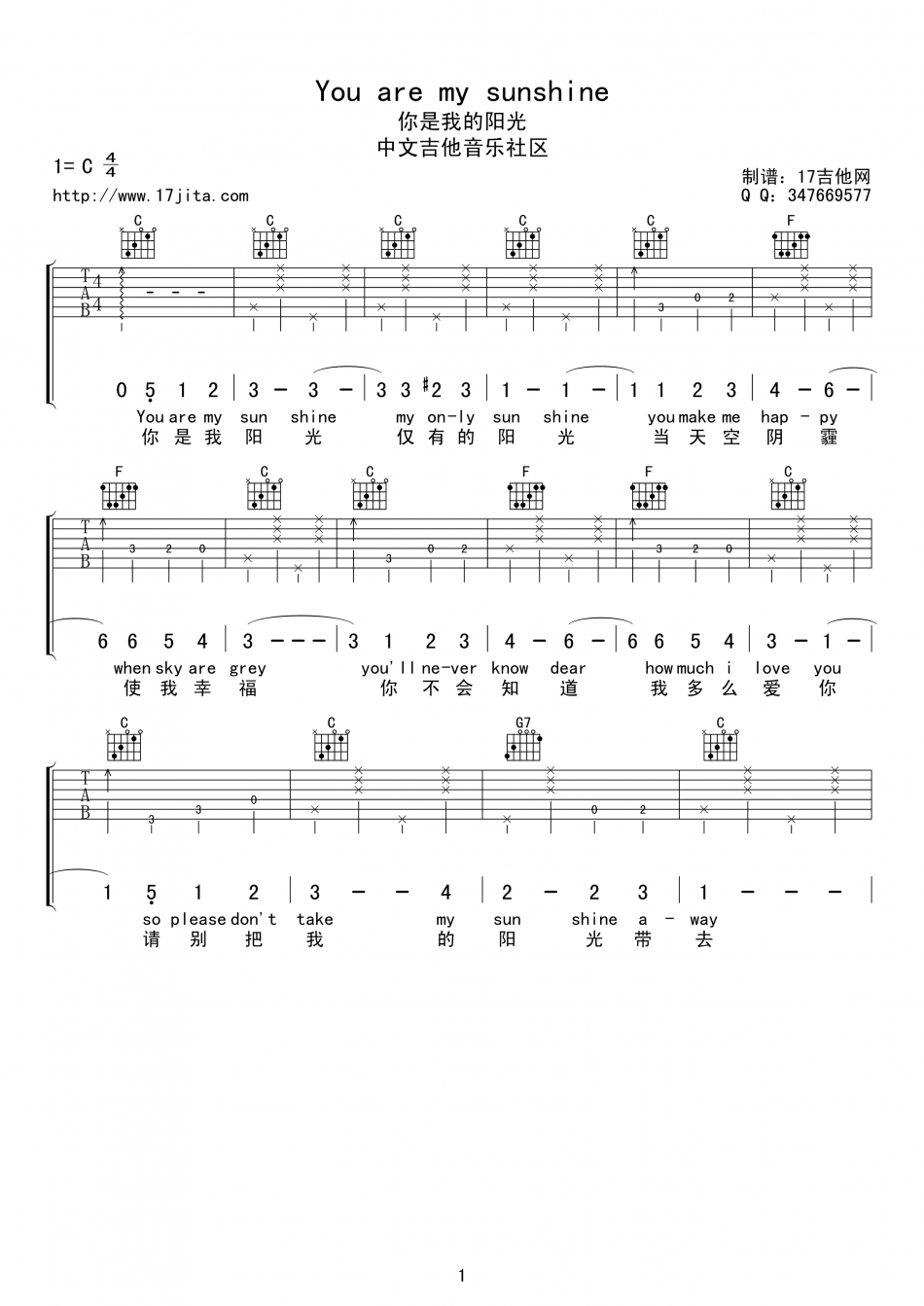 张靓颖《You Are My Sunshine》C调 吉他谱-图1