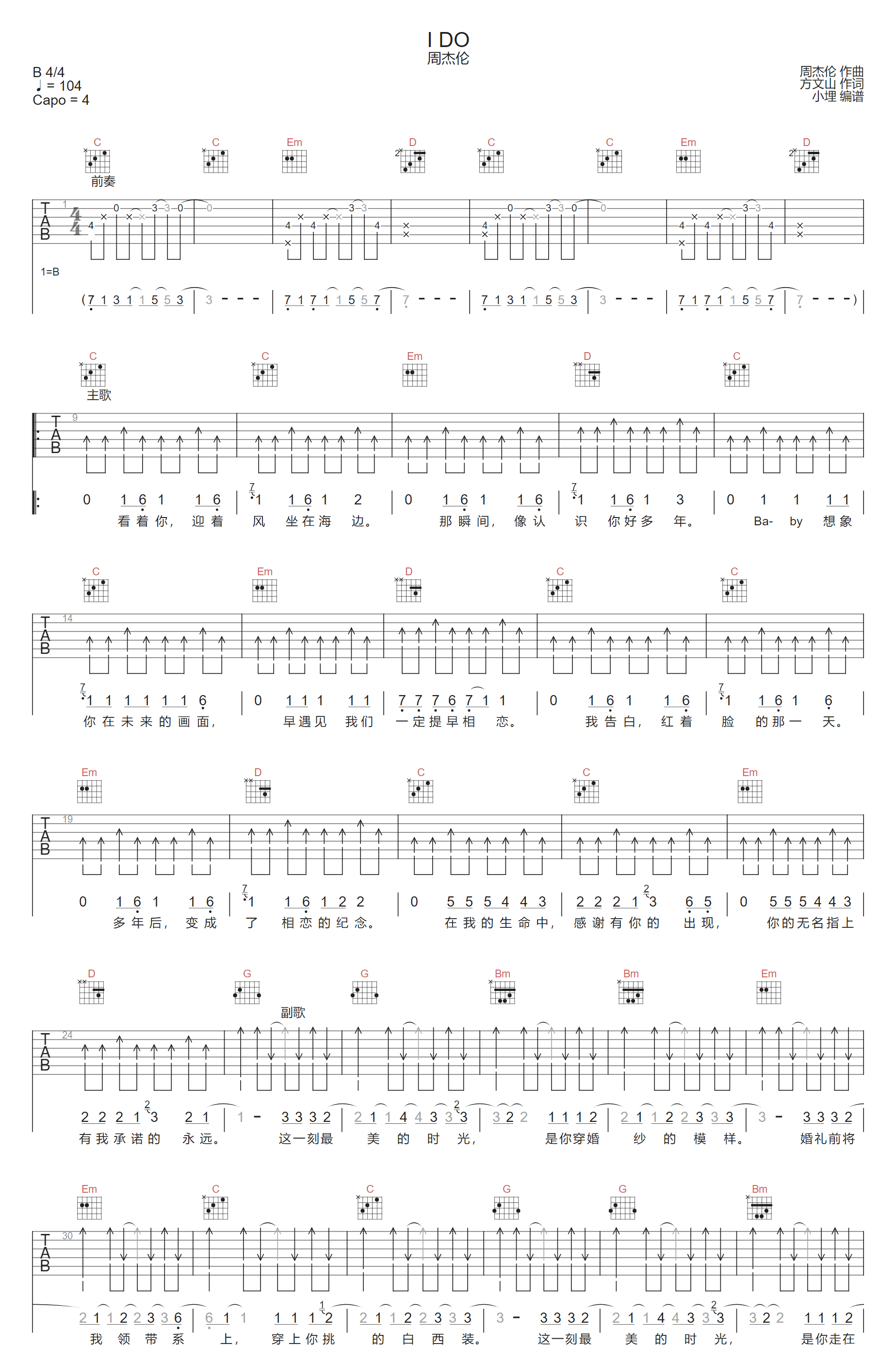 周杰伦《I Do》G 调原版弹唱谱,适配婚礼与告白场景,和弦简单好上手,新手也能轻松弹唱。旋律温柔浪漫,藏着周氏情歌独有的深情,歌词满是承诺与偏爱,弹起便是满屏甜蜜。高清六线谱标注清晰,节奏规整,还原歌曲温柔质感,无论是求婚弹唱、婚礼伴奏还是日常练习都适配,指尖流转的旋律,把最真挚的爱意唱给最爱的人。