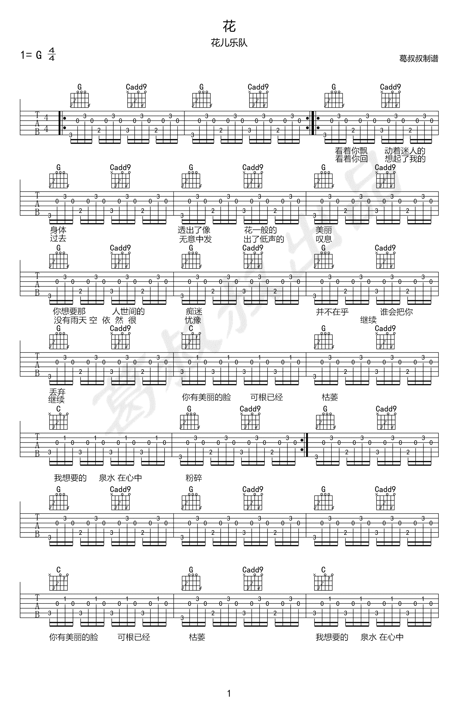 花儿乐队《花》G调 吉他谱_原版弹唱谱