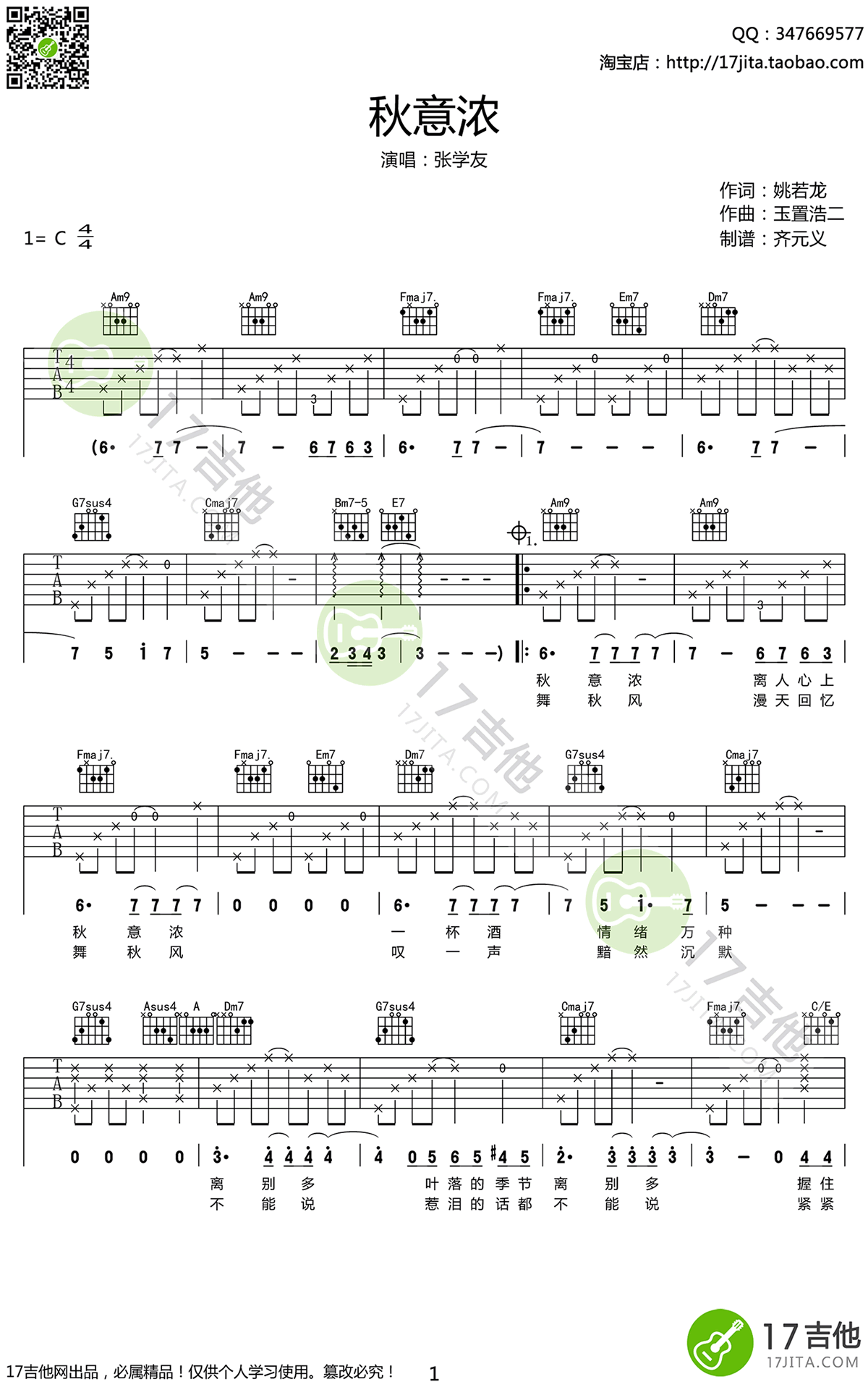 张学友经典金曲《秋意浓》C 调弹唱谱,4/4 拍原版编配,和弦流畅好按,新手也能快速上手。谱面含完整前奏、主副歌与间奏,指法清晰易读,无需大横按。弹唱氛围感拉满,深秋离愁随弦音缓缓流淌,一杯酒、一段情,句句深情。可按需调整变调夹适配音域,高清六线谱排版舒适,弹唱还原度高,秋日弹唱氛围感直接拉满。