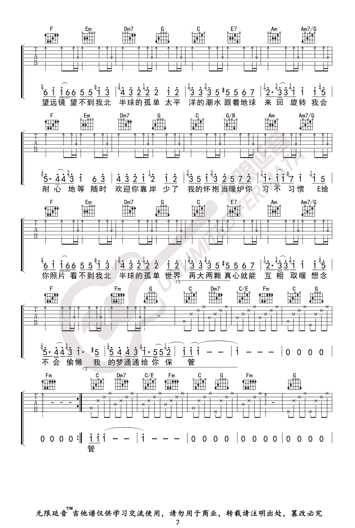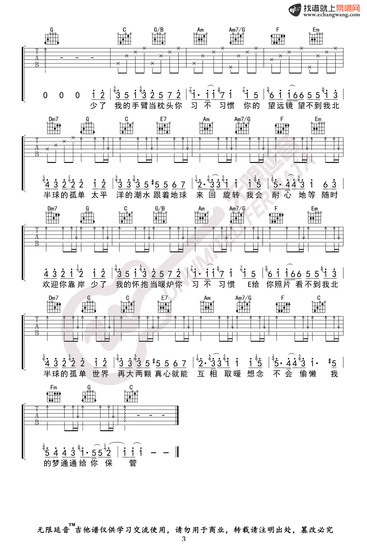 孤单北半球吉他谱_C调_欧得洋/梁静茹_弹唱谱
