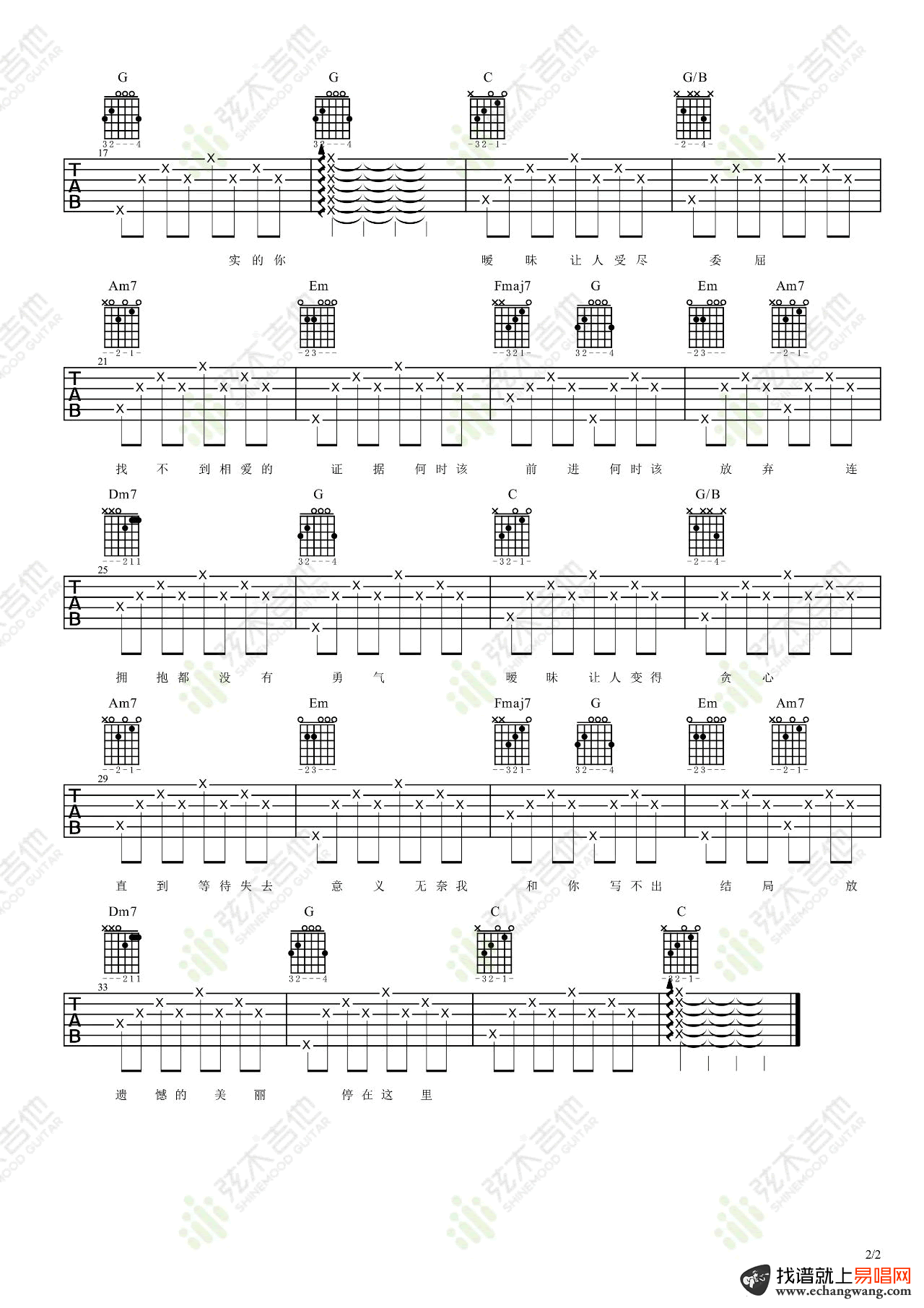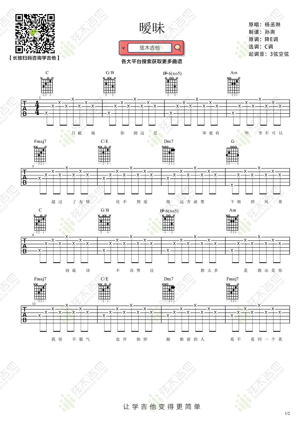 杨丞琳《暧昧》吉他谱_C调_吉他图片谱,指法_简单弹唱谱