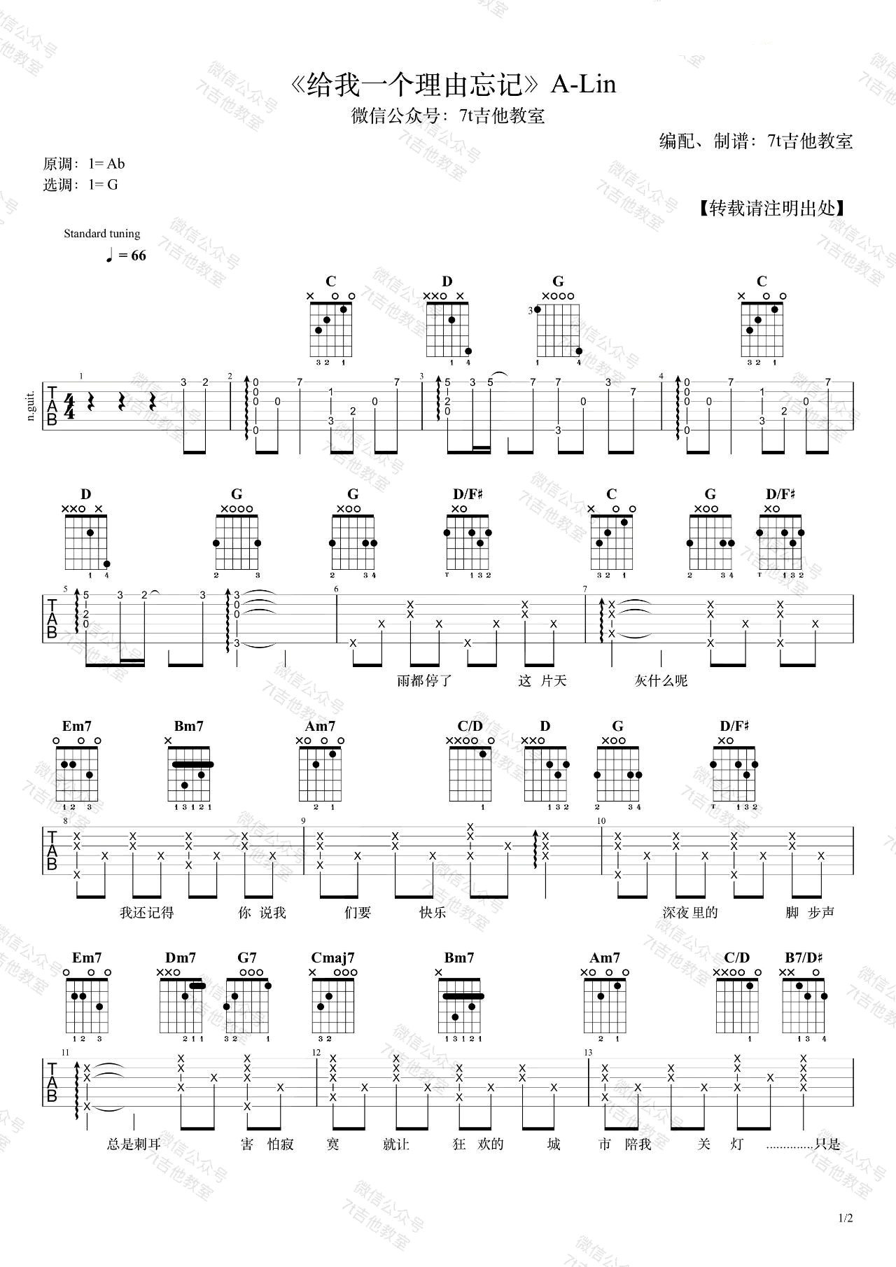 A-Lin《给我一个理由忘记》吉他谱_G调_吉他图片谱,弹唱谱