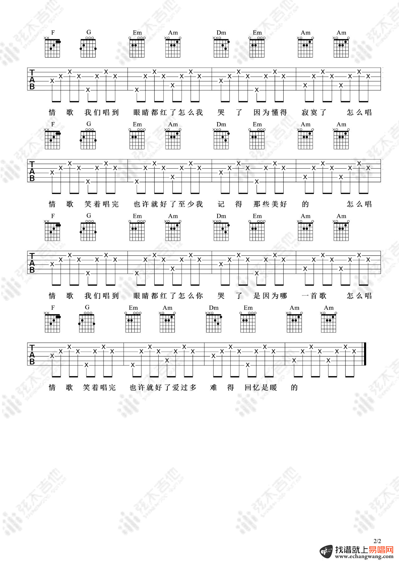 梁静茹《情歌》吉他谱_C调_吉他图片谱,简单版_弹唱谱
