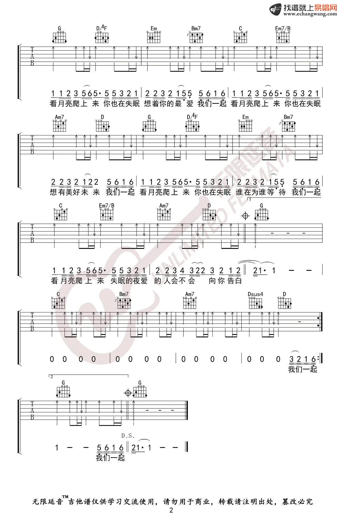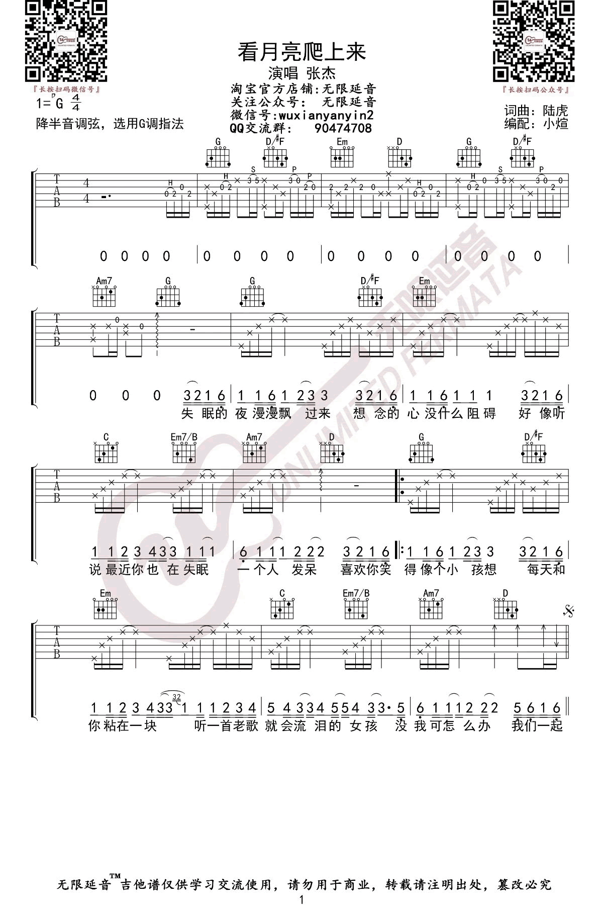 张杰《看月亮爬上来》吉他谱_G调_吉他图片谱,指法_弹唱谱