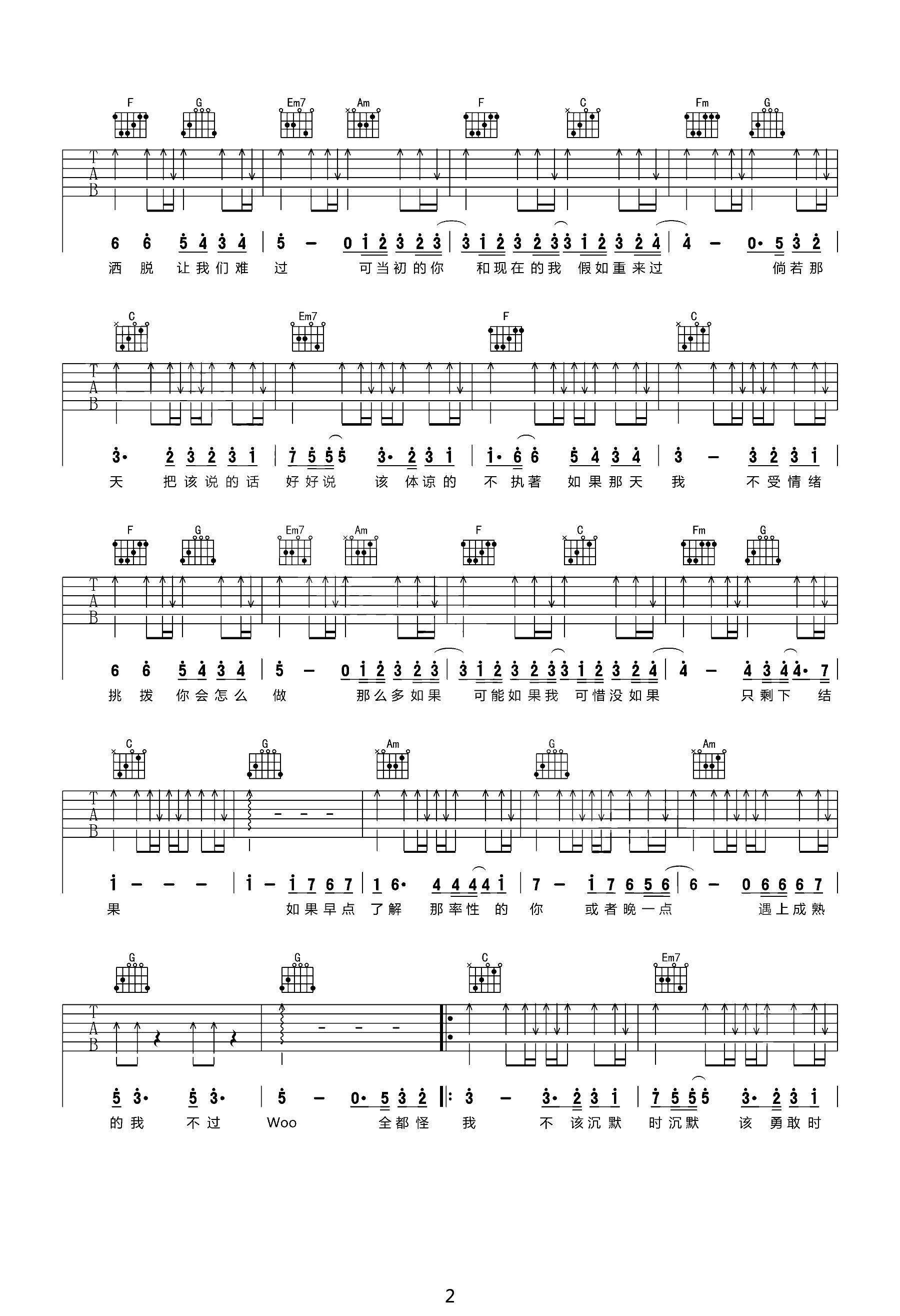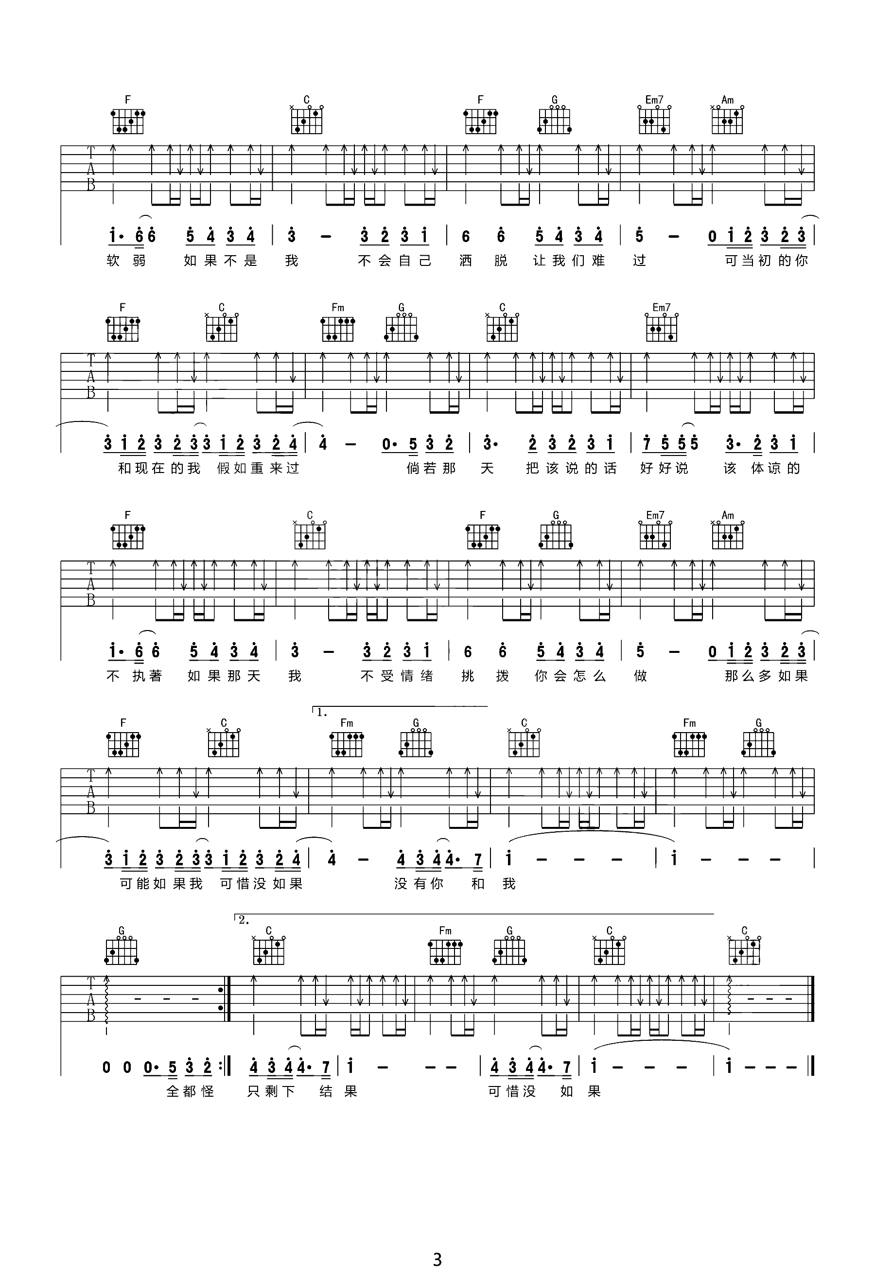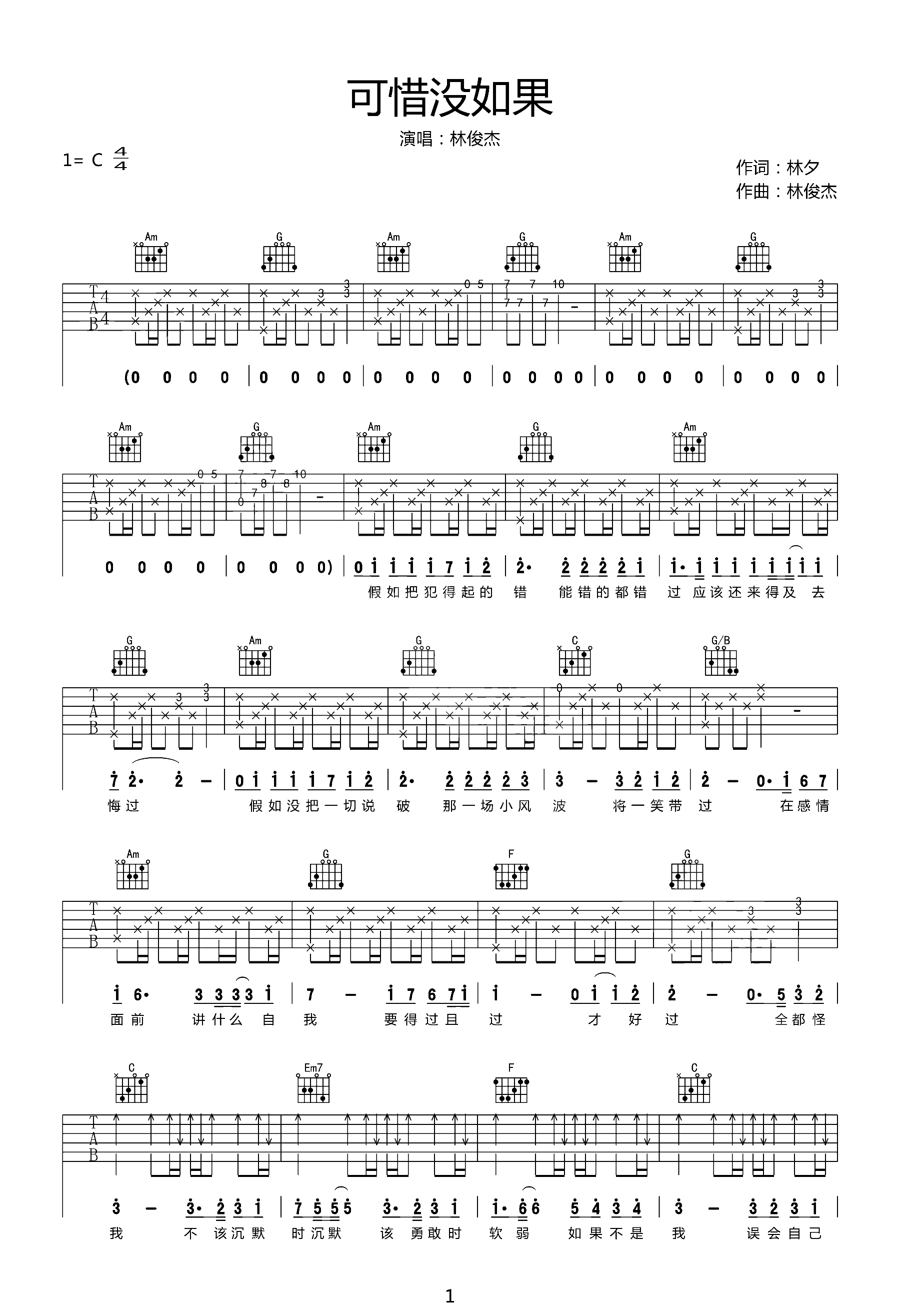 可惜没如果吉他图片谱,林俊杰演唱,一段擦肩而过的爱情,若我们当初勇敢一点,或许遗憾就不再存在。《可惜没如果》吉他弹唱谱,选用C调指法,原调编配不用变调夹,高清图片谱一共三张吉他图片谱例,谱大师上传分享。 歌曲如呼唤现实中诸多人们的感悟与经历。人生旅途中总有一些错过,如恒星闪耀于回忆之中。或许不频频怀念,但却永远不会褪色。对你默默的支持心存感激,即便相隔千里,不再联络。然我明了,你一直在身后倾注深情。