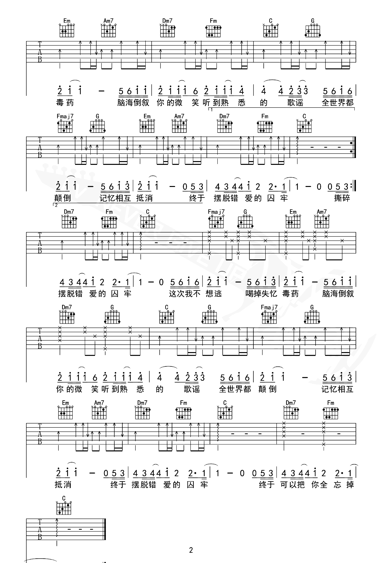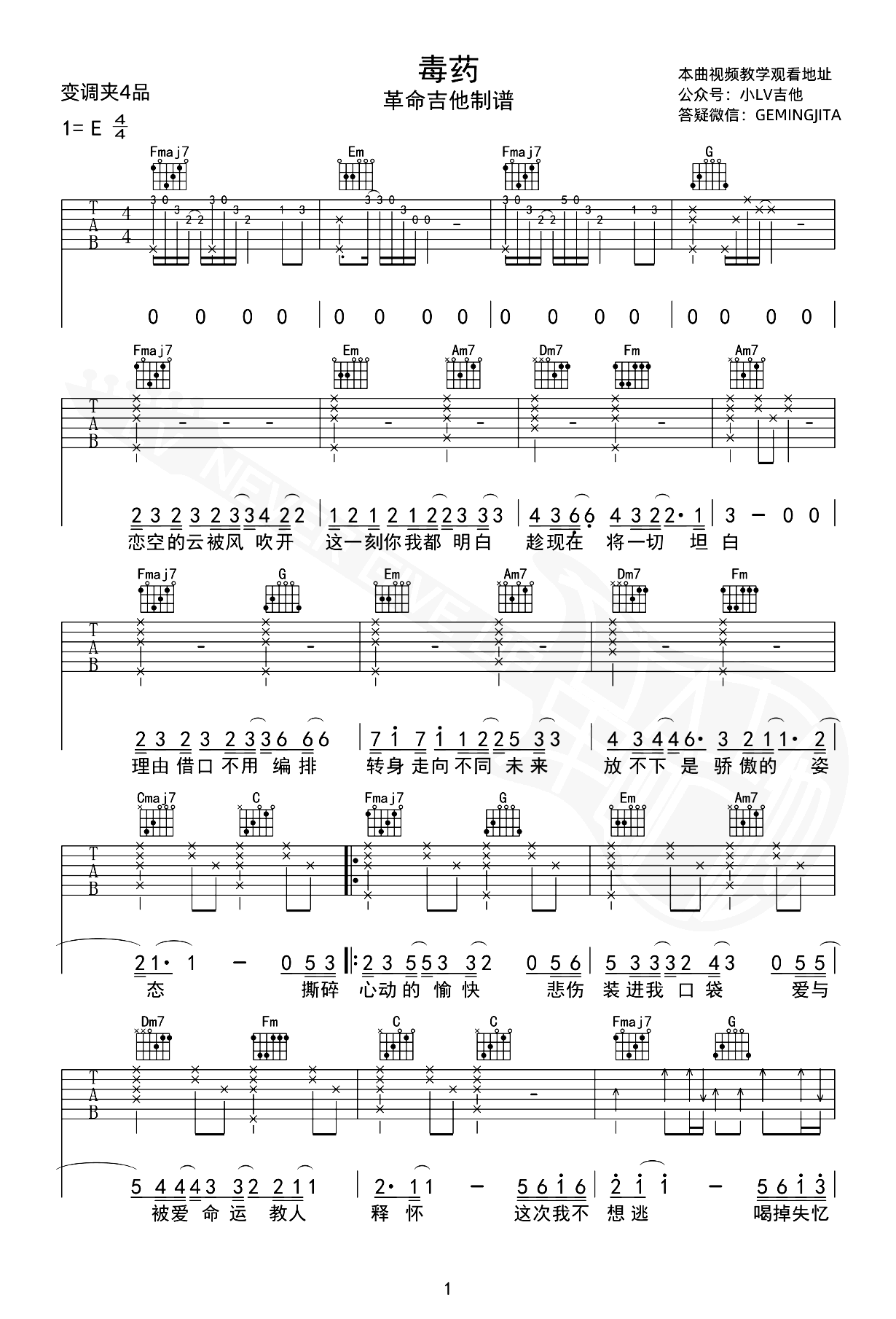 毒药吉他图片谱,周星星演唱的一首伤感情歌。爱与被爱,命运的纠葛,我不再躲避,倾饮失忆的毒药。《毒药》吉他弹唱谱,原调E,选用C调指法,变调夹夹第四品,吉他图片谱一共两张图片谱例,感谢革命吉他编配出品,谱大师上传分享。 纵身扭转命运的舞姿,当爱情画上句点的瞬间,将记忆交予清风吹散,遗憾隐于时光,遗忘穿越云霄,在那真切的旋律中,我们心灵相契,若世间真有一杯遗忘的毒药,你愿意品饮其中芬芳吗?
