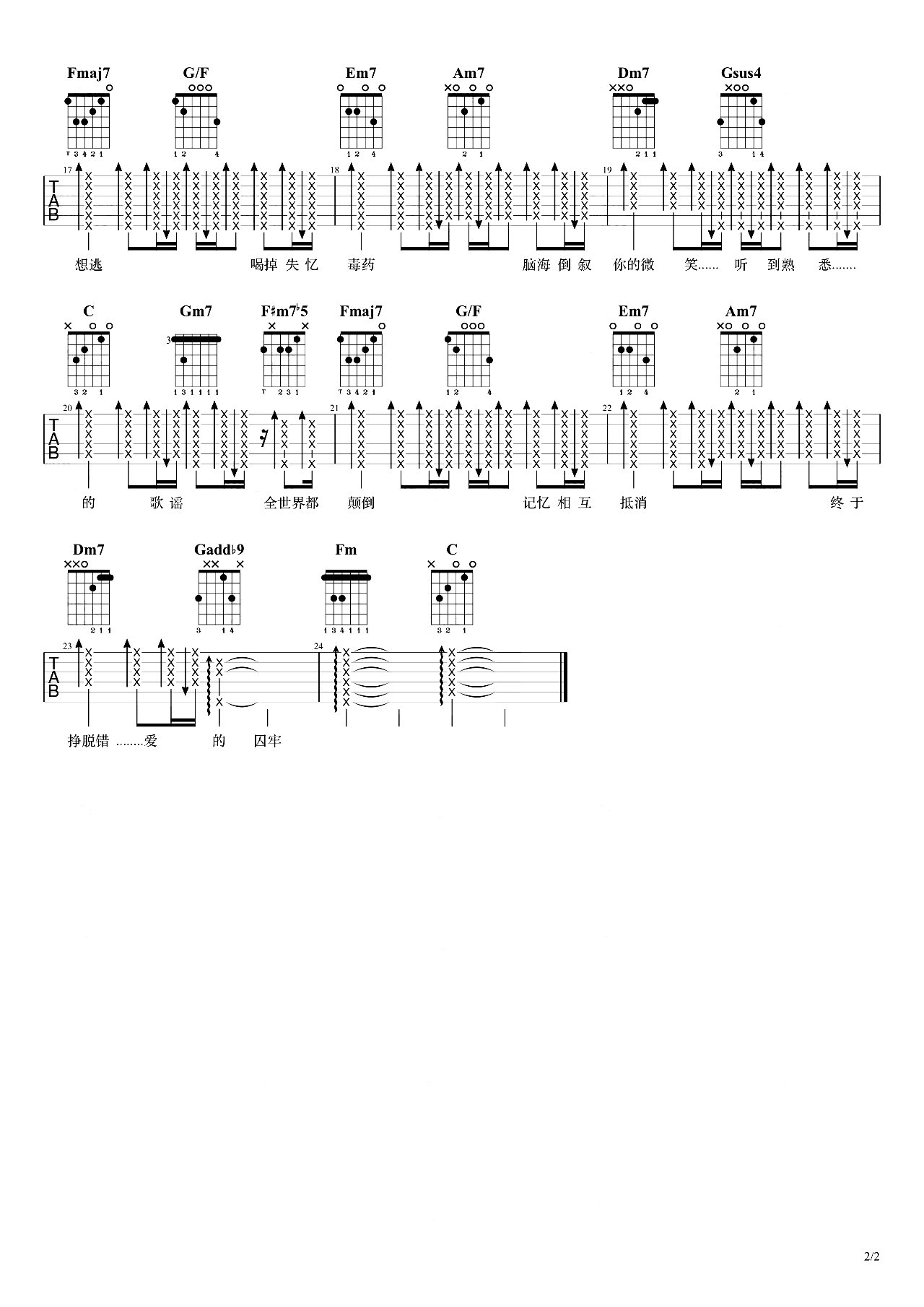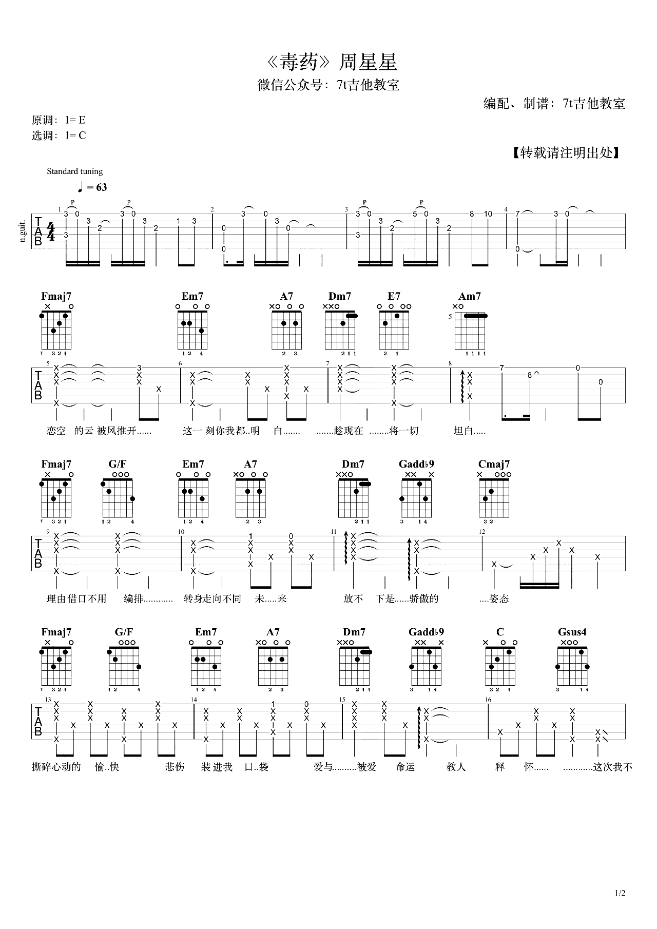 毒药吉他图片谱,周星星演唱,一首网络热门歌曲,随谱附上吉他弹唱演示视频。《毒药》吉他弹唱谱,这首歌的原调是E大调,用的是C大调的指法来编配,演示视频里是标准音调弦。弹原调需夹4品!吉他图片谱一共两张图片谱例,感谢7T吉他教室出品,谱大师上传。 和弦分析:歌曲开头用到了一些副属和弦,如 A7 → Dm7 还有 E7 → Am7。有些地方终止式的五级加了降九音,其实五级的降九音跟四级小三和弦的三音是同一个音,我们知道四级小三和弦也是常常用在终止式的地方,而且它的特色之处就在于三音,由此五级在这里加入降九音其实跟四级小三和弦的效果类似,或者这里也可以用之前讲过的属七降九,也是一样的道理。另外歌曲结尾也用到了四级小三和弦。还有一个比较有意思的地方在于副歌两段之间的连接处,比较多见的用法是251离调 Gm7 → C7 → Fmaj7,而本曲在四级前面用了升四级半减七 Gm7 → F#m7-5 → Fmaj7,变成了根音半音下行的方式。