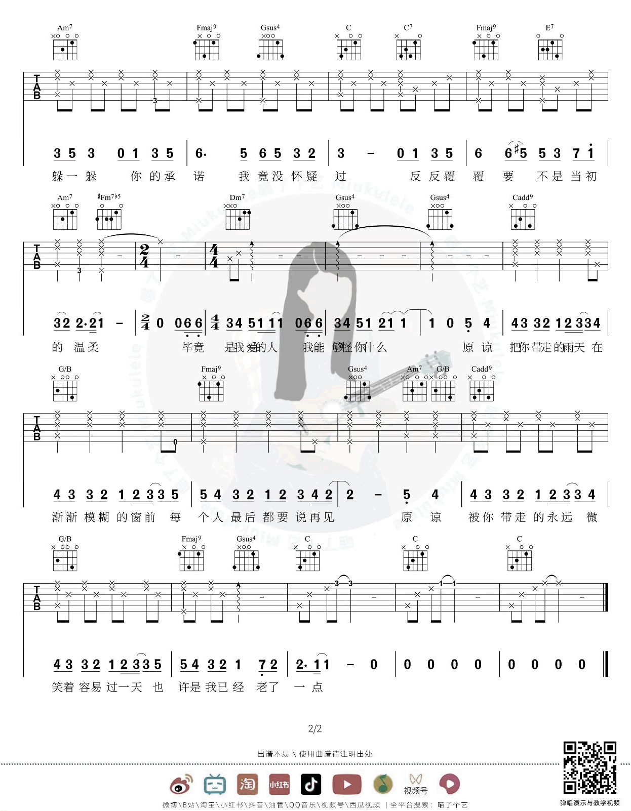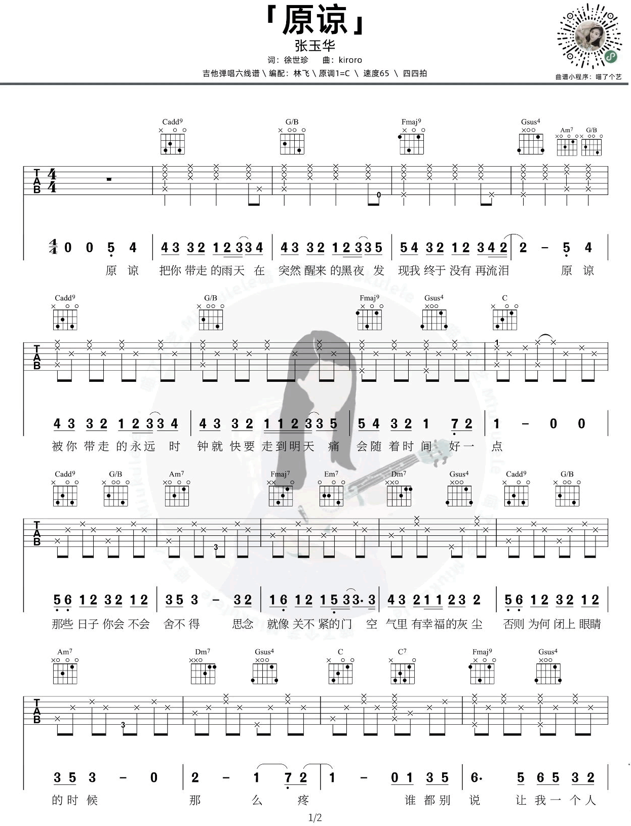 原谅吉他图片谱,张玉华一首经典代表歌曲,随谱同步配套吉他教学视频。《原谅》吉他弹唱谱,选用C调指法,原调演奏不用变调夹,吉他图片谱一共两张图片谱例,感谢喵了个艺出品分享,谱大师上传更新。