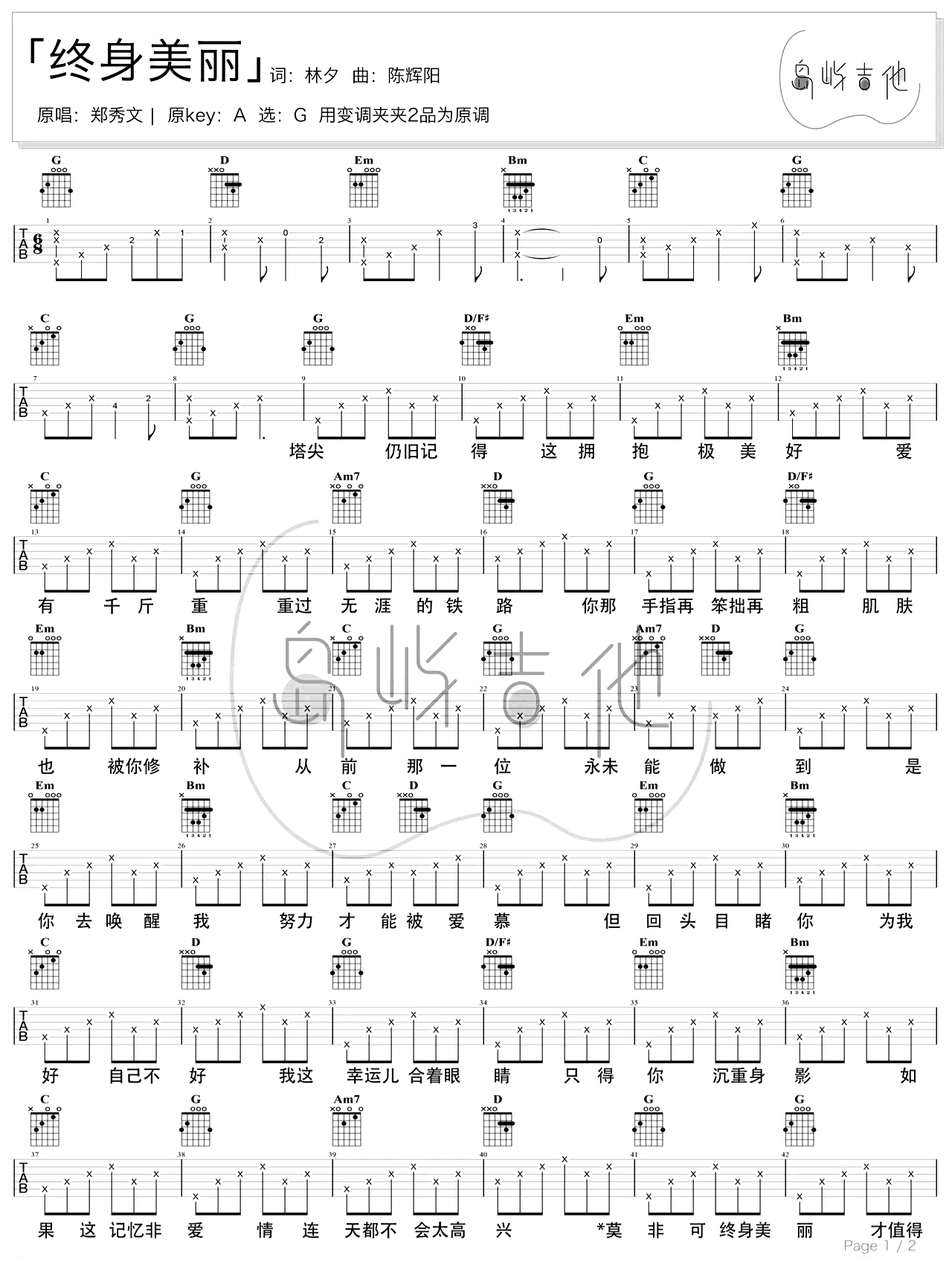 郑秀文《终身美丽》吉他谱_G调_吉他图片谱,弹唱谱_吉他教学视频