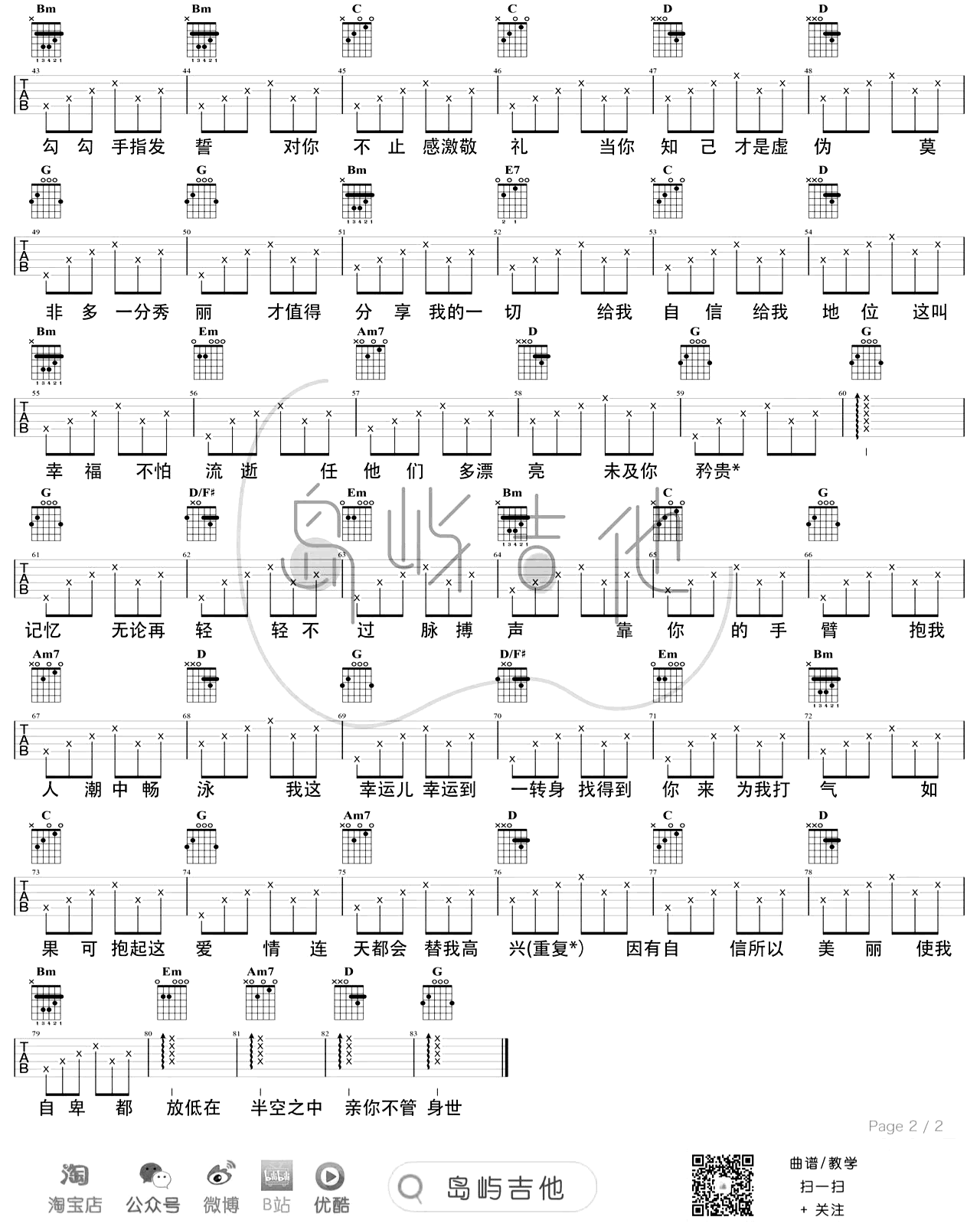 终身美丽吉他图片谱,郑秀文演唱的一首经典粤语歌曲歌曲。随谱同步吉他弹唱教学视频。电影《瘦身男女》 主题曲,《终身美丽》吉他弹唱谱,选用G调指法,原调为A编配,变调夹夹第二品,吉他图片谱一共两张图片,感谢岛屿吉他出品分享,谱大师上传。 没有人能够逃离衰老的命运,但有些人可以一生保持美丽。而美丽是什么?它应该由每个人自己来定义。那温柔的嗓音,坚强而勇敢地传达着音乐的力量。这首歌不仅仅讲述爱情,在每个人生阶段都可以听到其中的新感触,获得成长。愿你我都能终身美丽。