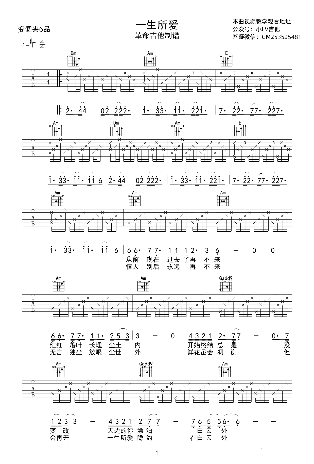 一生所爱茶吉他图片谱,随谱附上最为详细的吉他弹唱教学视频。卢冠廷的一首经典代表歌曲,周星驰《大话西游》电影主题曲。 《一生所爱》吉他弹唱谱,原调升F,选用C调和弦指法,变调夹夹六品,一共两张图片吉他图片谱,感谢革命吉他编配出品,谱大师上传更新上传。 人生中难免会有缘分匆匆而过,遗憾萦绕心头。但它们构成了我们生命中最动人的篇章。即便爱情不能永远相伴,那些美好编织成故事,依然让我们在回忆里重温那些令人心醉的时光。