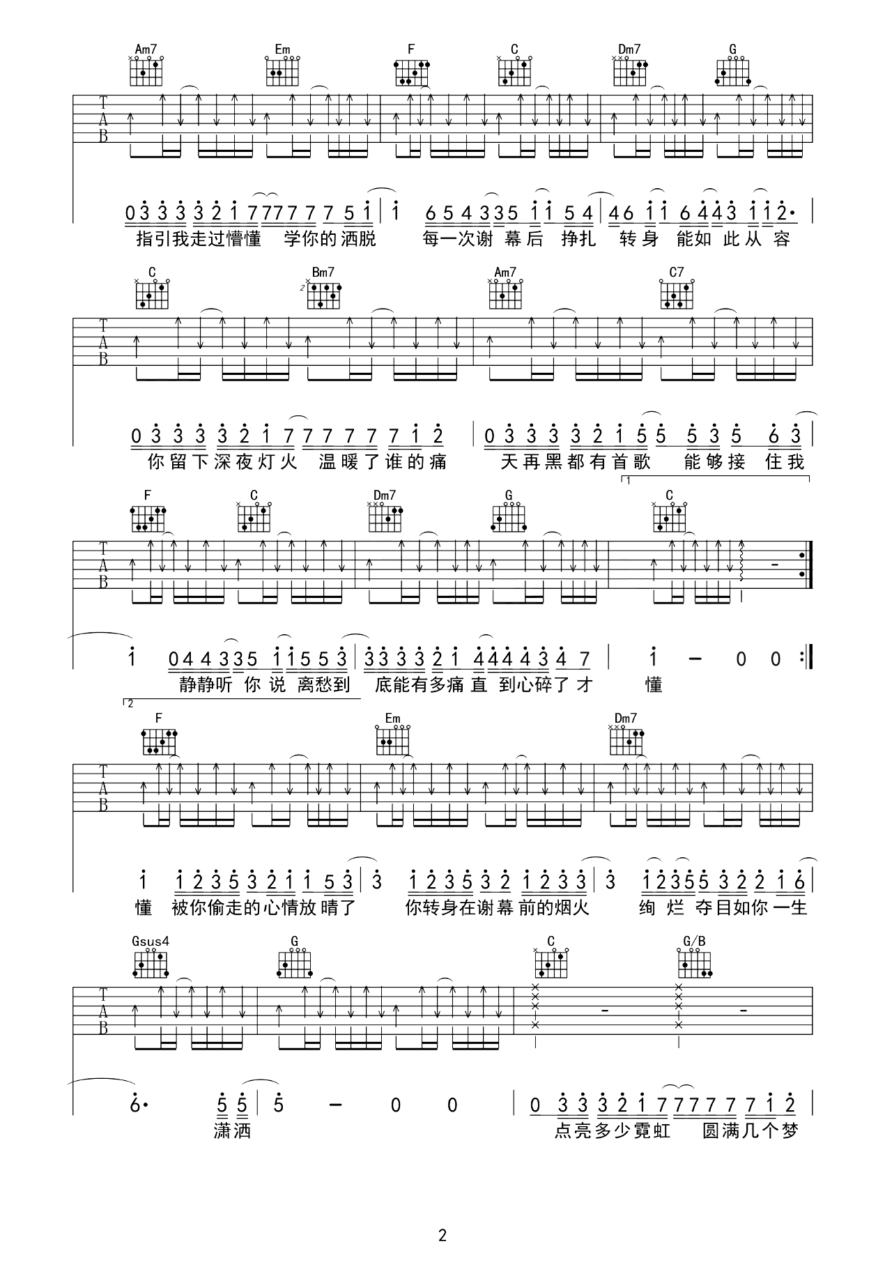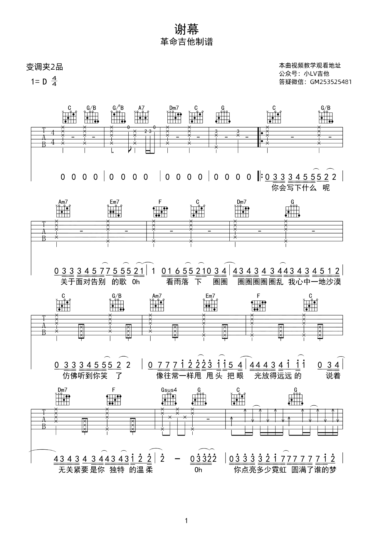 谢幕吉他图片谱,林俊杰一首音乐榜热门新歌,歌曲中的旋律温柔动人,让人不禁感受到了林俊杰对恩师的深深怀念和感激之情。 《谢幕》吉他弹唱谱,原调为D,选用C调指法编配,变调夹Capo2品。方框代表拍弦,歌曲不太容易唱,琴友们多花些功夫练习。完整吉他图片谱一共三张图片谱例,感谢革命吉他制谱分享,谱大师更新上传。 这首歌是林俊杰对恩师林秋离的一份深情告白,也是他对音乐的热爱和执着的表达。无论是歌曲的旋律还是歌词的意境,都让人感受到了林俊杰对恩师的深深感激之情。