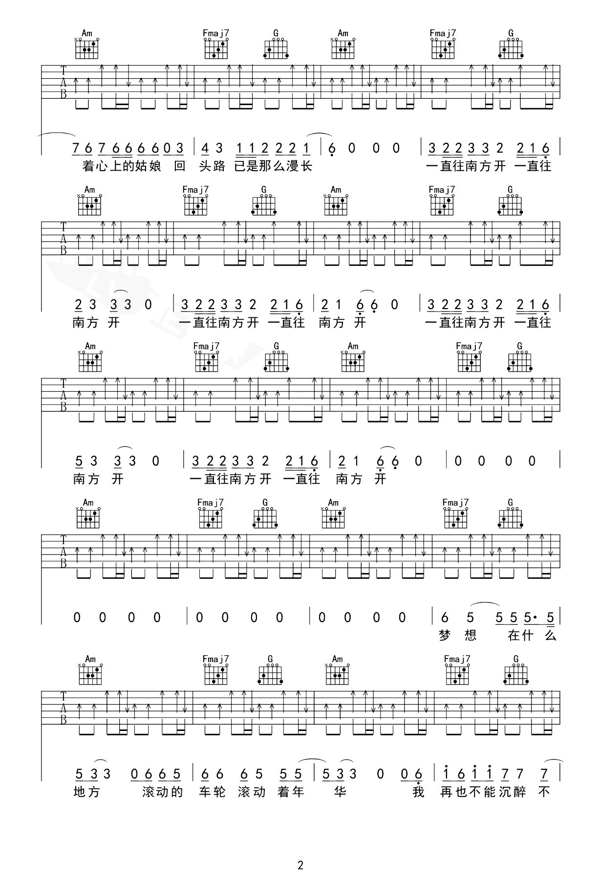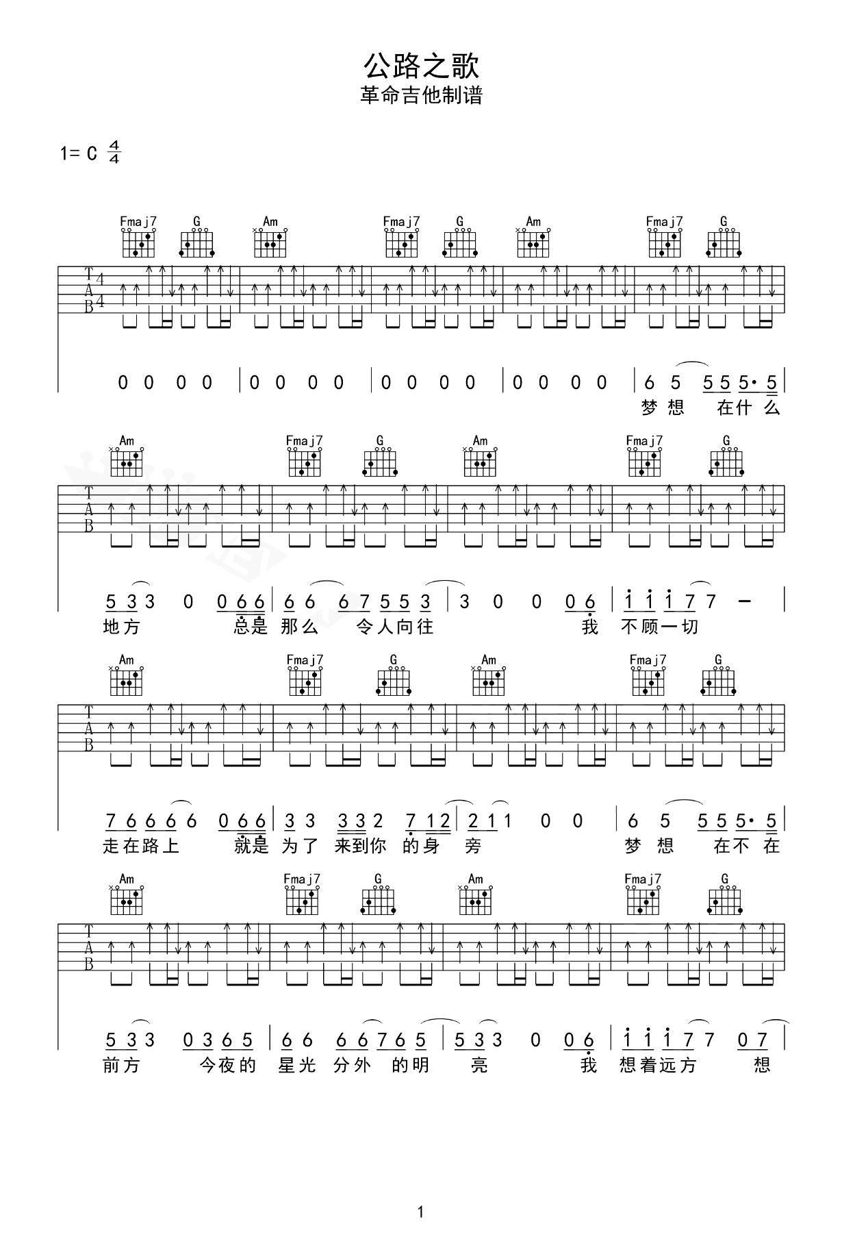 公路之歌吉他图片谱,痛苦的信仰乐队一首经典歌曲。无论选择哪条道路,我们都需付出努力和汗水,才能实现自己的梦想。 《公路之歌》吉他弹唱谱,选用C调指法编配,不用变调夹整首歌曲只用到了3个和弦,没有大横采用。吉他图片谱完整版一共四张图片,感谢革命吉他出品分享,谱大师上传更新。 当我们选择了通向梦想的道路,不论前路如何,我们都应该坚定前行,一路砥砺前行,永不放弃。因为,人生就像一场旅程,需勇气和决心去面对其中的坎坷和挑战,只有坚持不懈,才能让自己的梦想变成现实。
