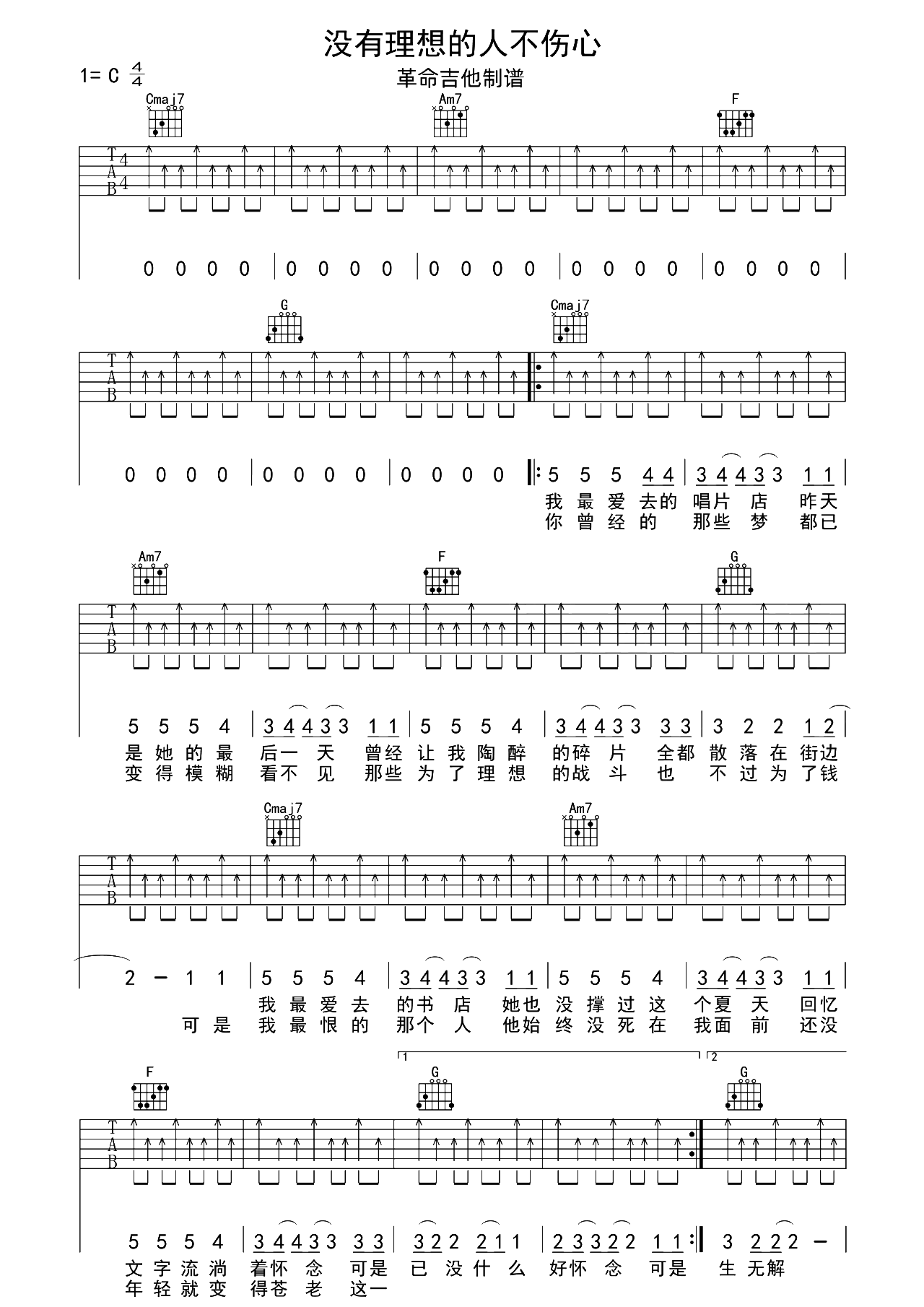 没有理想的人不伤心吉他图片谱,新裤子乐队一首经典歌曲,生命的旅程充满了挑战和机遇,只有我们不断地前行,才能够发现更加美好的未来。《没有理想的人不伤心》吉他弹唱谱,吉他图片谱采用了C调指法进行编配,完整版吉他图片谱一共三张图片谱例。感谢革命吉他分享,谱大师上传更新。 以激昂的节奏点燃了内心的热血,让我们感受到了生命的澎湃。即使我们没有理想,这并不可怕,可怕的是被理想所打败。当我们在平淡的人生中经历了坎坷,我们也将迎来自己的成长。
