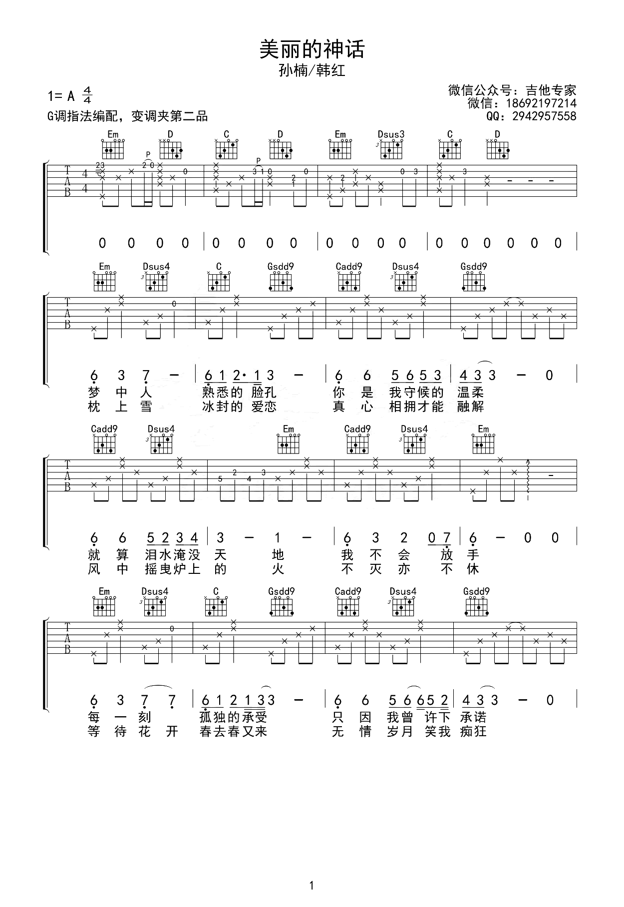 美丽的神话吉他图片谱,孙楠韩红的一首经典男女合唱情歌,也是成龙金喜善电影《神话》主题曲,附上吉他示范教学视频,《美丽的神话》吉他弹唱谱,原调A调,采用G调和弦指法编配,变调夹第二品,完整版吉他图片谱一共三张图片,感谢吉他专家分享出品,谱大师更新上传。 旋律缱绻,淡淡忧伤, 歌词如泣如诉, 诉说着爱与等待, 承诺与执着的故事。人生路漫漫,爱与执着, 唯有坚守初心,方能不负始终。