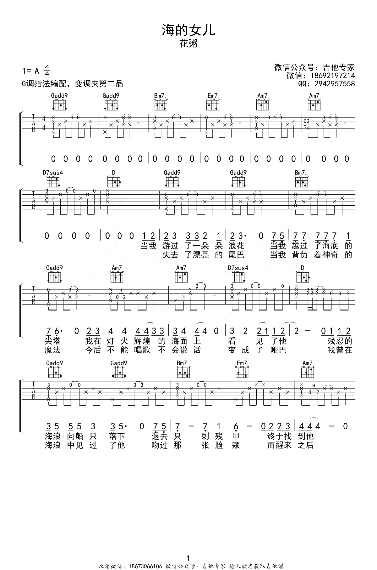 花粥《海的女儿》吉他谱_G调_吉他图片谱,弹唱谱