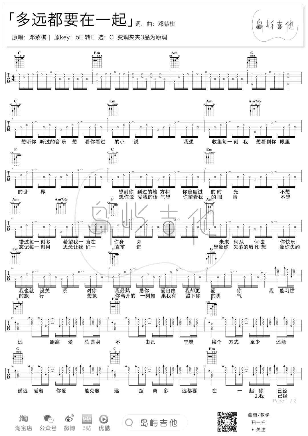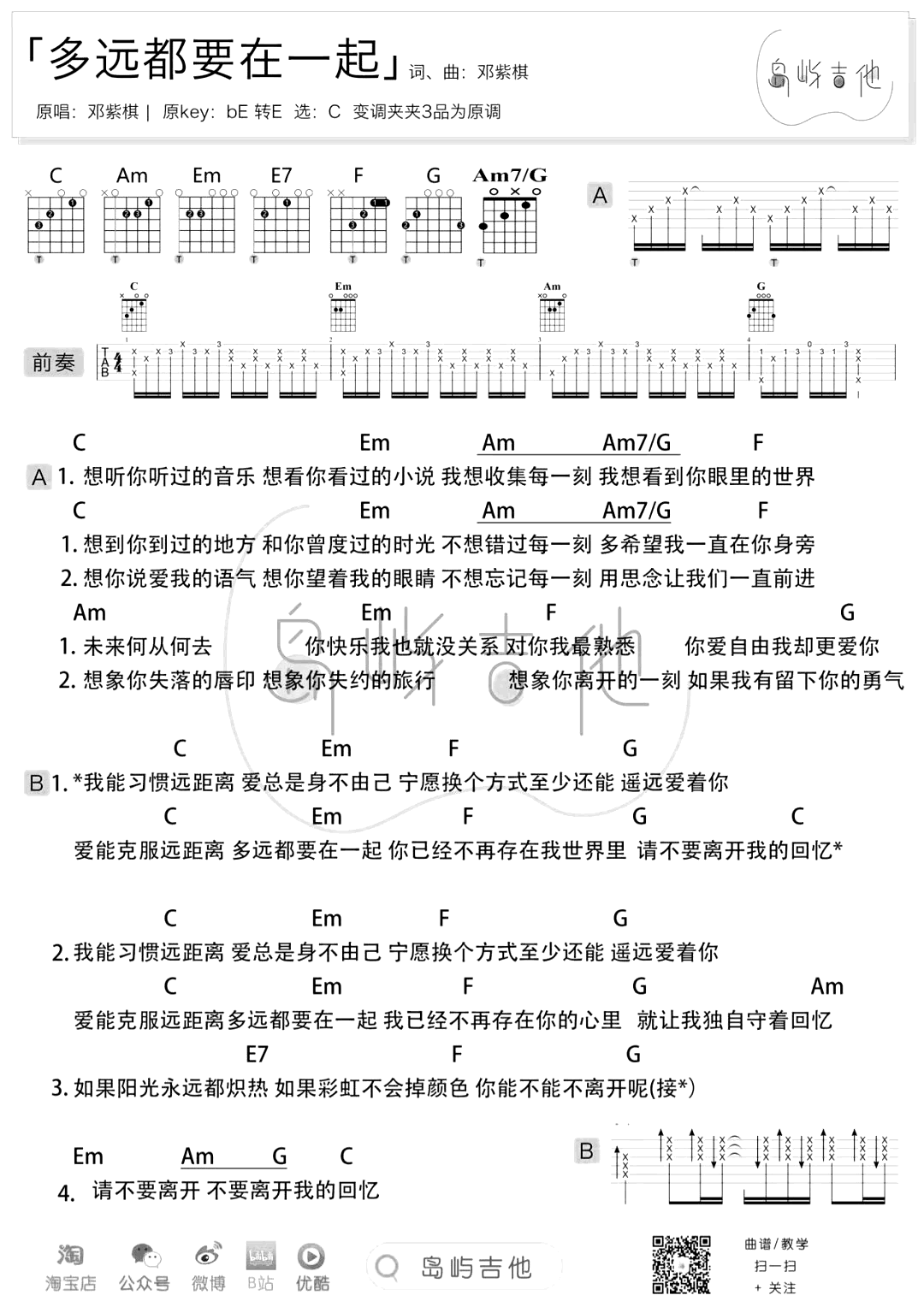 多远都要在一起吉他图片谱,邓紫棋一首经典情歌。因为爱你才一直坚持,听哭多少异地恋...《多远都要在一起》吉他弹唱谱,原调bE,选用C调指法编配,变调夹夹三品,吉他图片谱和弦谱一共两张谱例。 “爱能克服远距离 多远都要在一起”,距离不是问题,爱没学过地理,失恋后听一次哭一次的歌。随谱附上吉他弹唱视频,琴友们参考老师的示范讲解练习起来吧。