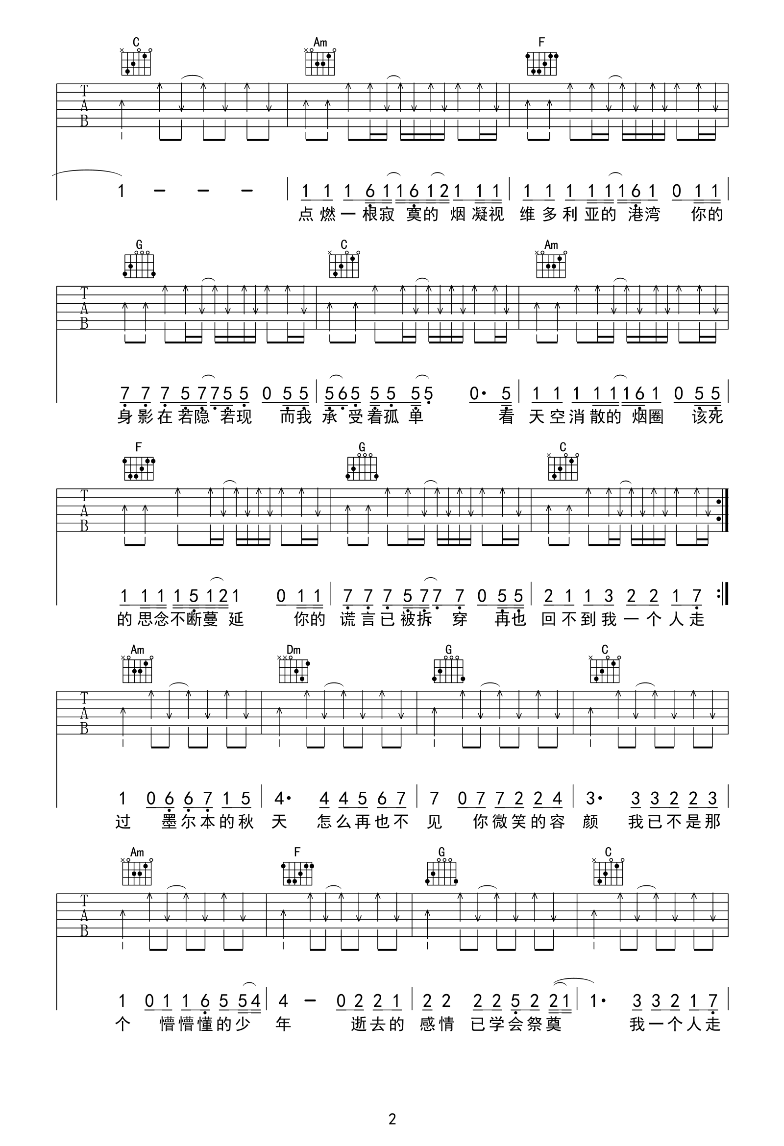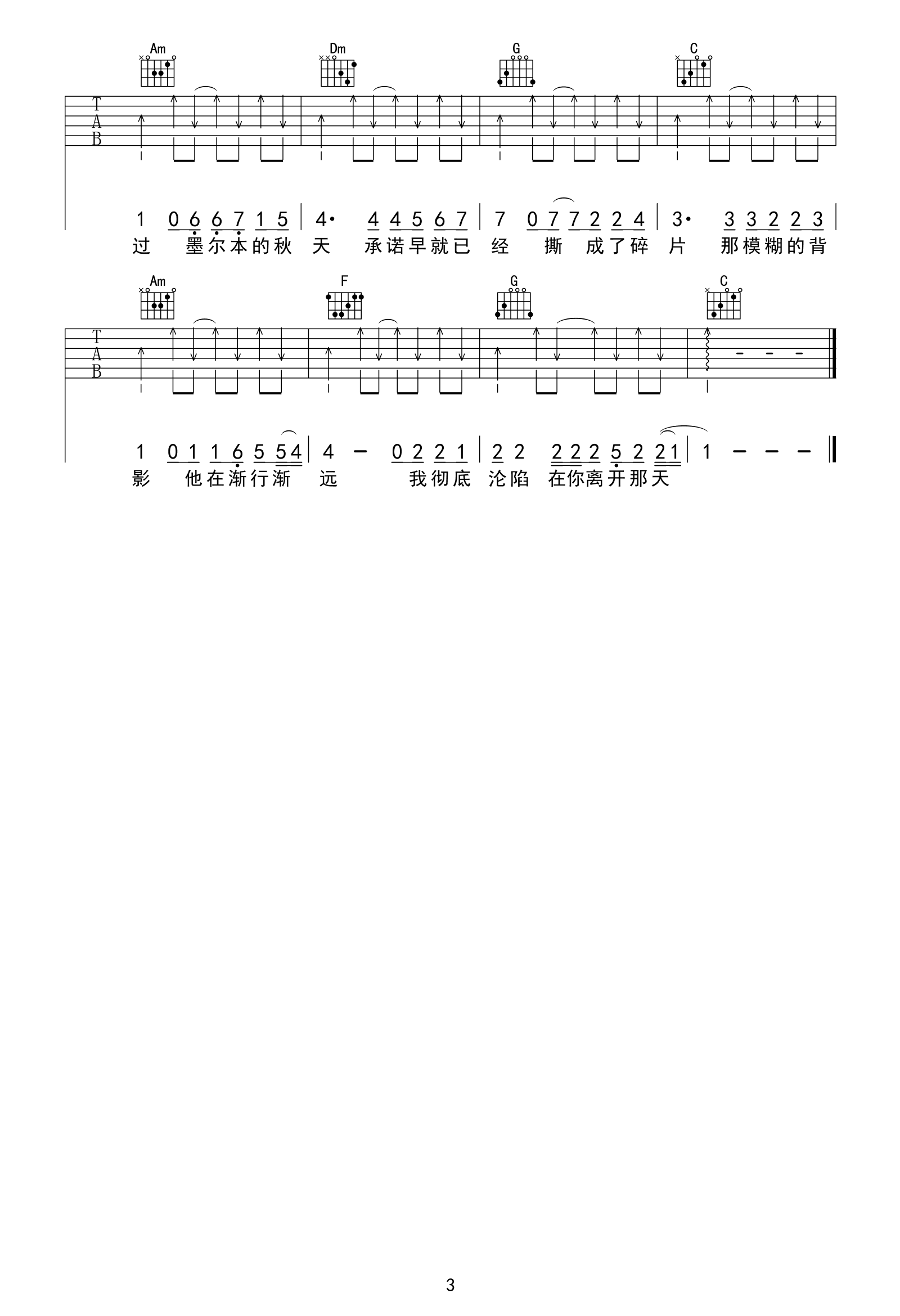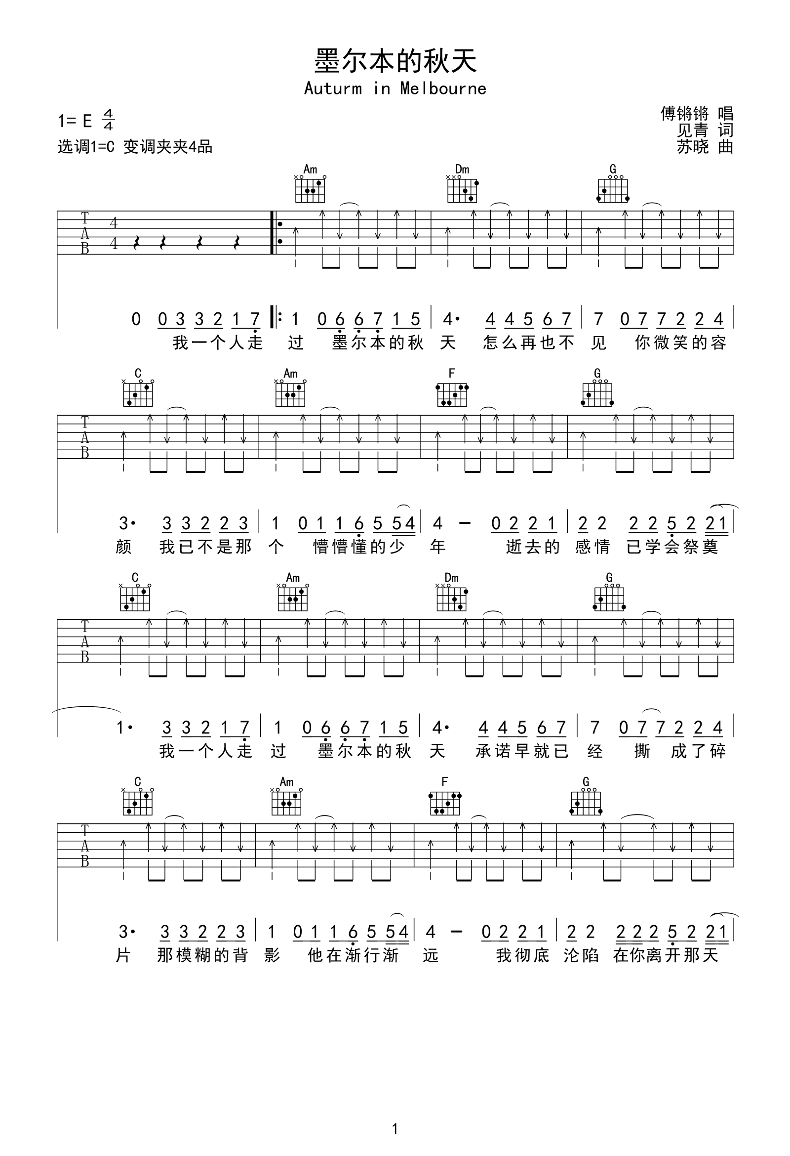 墨尔本的秋天吉他图片谱,傅锵锵演唱的一首网络热门情歌。生命中遇到的好多人,走着走着就不见了,尽管再也回不到从前,但思念永远在心底。《墨尔本的秋天》吉他弹唱吉他图片谱,原调E,选用C调指法编配,变调夹夹4品,高清图片谱一共三张谱例。 很多东西不知不觉中已顺着指缝流逝,一年前一年后,有些情感只剩下祭奠。感慨也好,唏嘘也罢,人总得往前看,路过的风景赏过即可,收纳不了的景色且让它随风去罢。