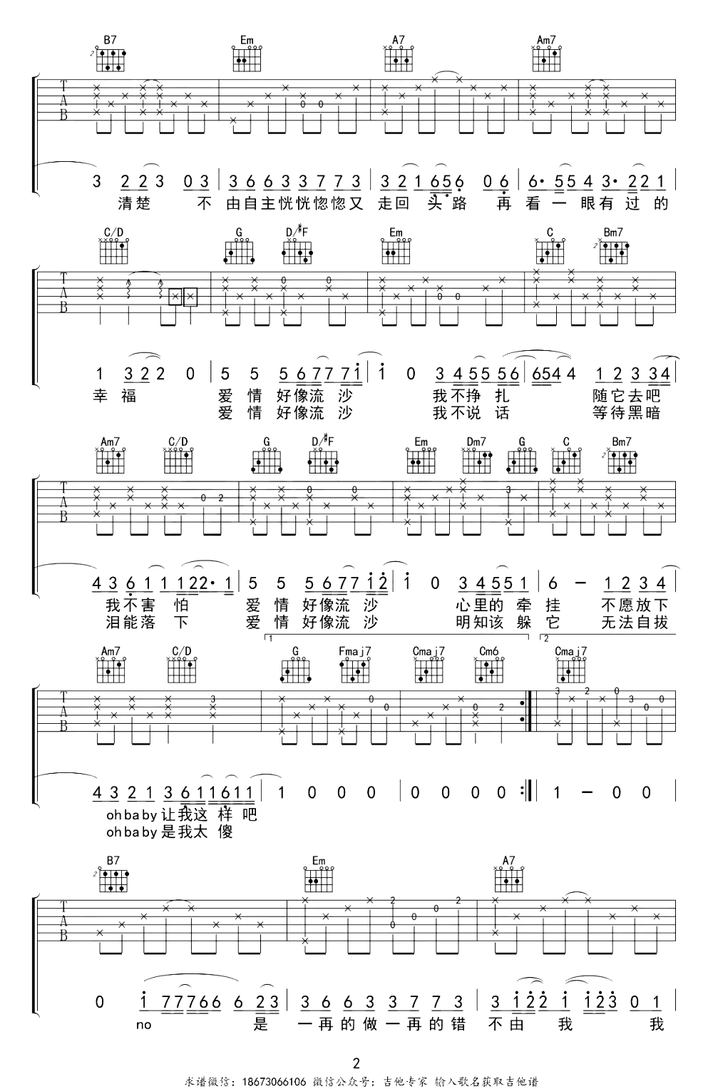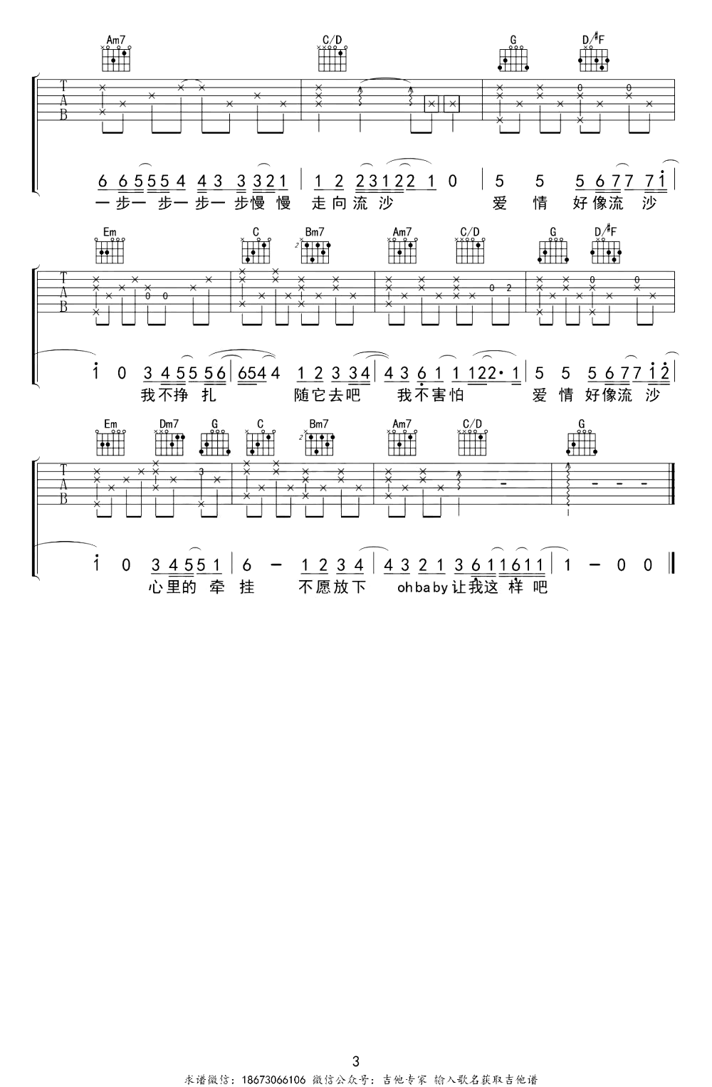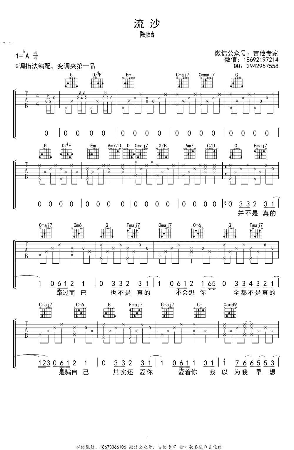 流沙吉他图片谱,陶喆演唱的经典R&B歌曲。爱情好像流沙,让人越陷越深。《流沙》吉他弹唱谱,原调A调,选用G调指法编配,变调夹夹一品,完整版一共三张图片谱。 周杰伦说爱情走的太快就像龙卷风,林俊杰说握不住的沙干脆扬了它,陶喆说爱情就像〈流沙〉我不害怕~旋律深入人心,唱出了对爱情的感受。