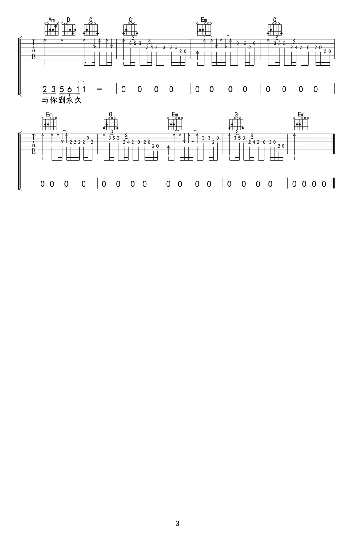 与你到永久吉他图片谱,伍佰的一首经典浪漫老歌。用快乐表现悲伤,又从悲伤中回归恬淡。《与你到永久》吉他弹唱谱,选用G调和弦指法,吉他图片谱一共三张高清图片。 优美的旋律唯美的歌词铺陈出了格外的温馨的意境,让人不由自主心生一股款款的温情,仿佛被雨水冲洗过的心灵一样清澈澄明。