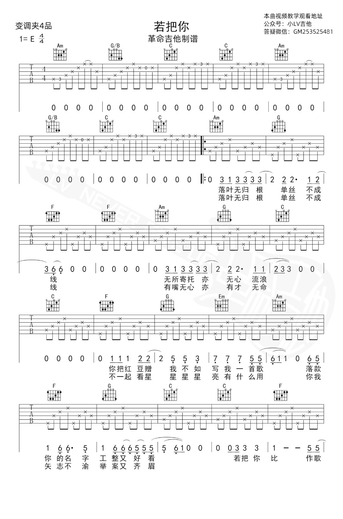 若把你吉他图片谱,Kirsty刘瑾睿演唱,一首网络热门歌曲。若把你比作歌,你便是那高山流水。《若把你》吉他弹唱谱,原调E,选用C调指法编配,变调夹夹第四品,一共两张图片吉他图片谱。 这位名不见经传的女歌手在参加了B站原创音乐综艺节目《我的音乐你听吗》,演唱《若把你》的那一场拿到了最高票数,最终取得亚军的好成绩。