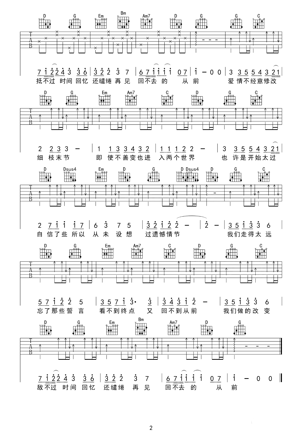 回不去的从前吉他图片谱,周延英演唱,一首让人反复循环的经典流行歌曲。我们做的改变,敌不过时间。《回不去的从前》吉他弹唱谱,选用G调指法编配,不用变调夹,吉他图片谱一共两张图片谱。随谱附上吉他弹唱教学视频,和弦指法简易好学,琴友们参考老师超详细讲解练习起来。 有一种状态叫进退两难,有一种爱情叫回不去的从前。有些伤痕一旦出现了,就算掩藏,也是梗在心头的一根刺,隐隐作痛!从前的誓言,渐行渐远,回不去也无法继续向前。