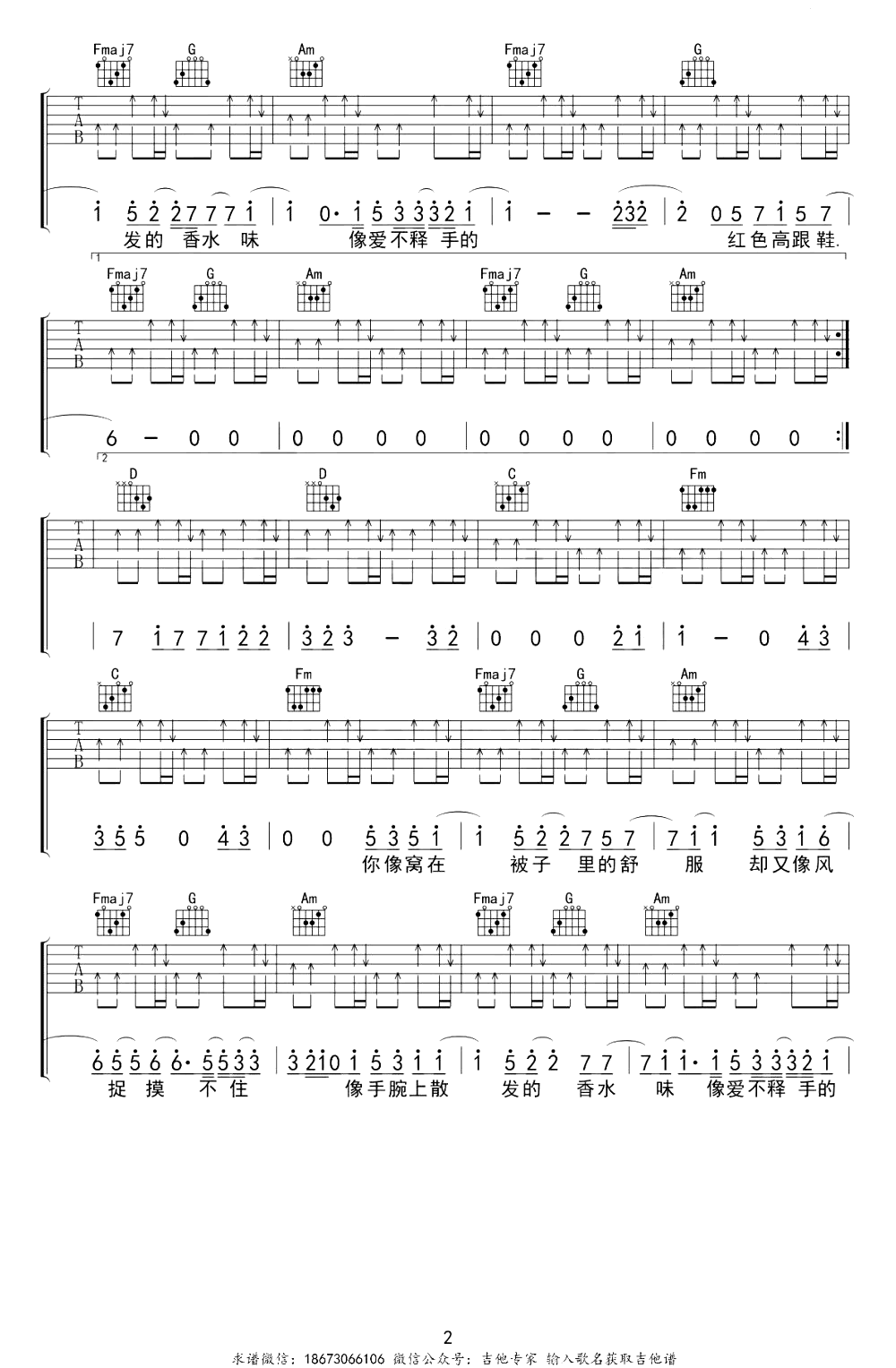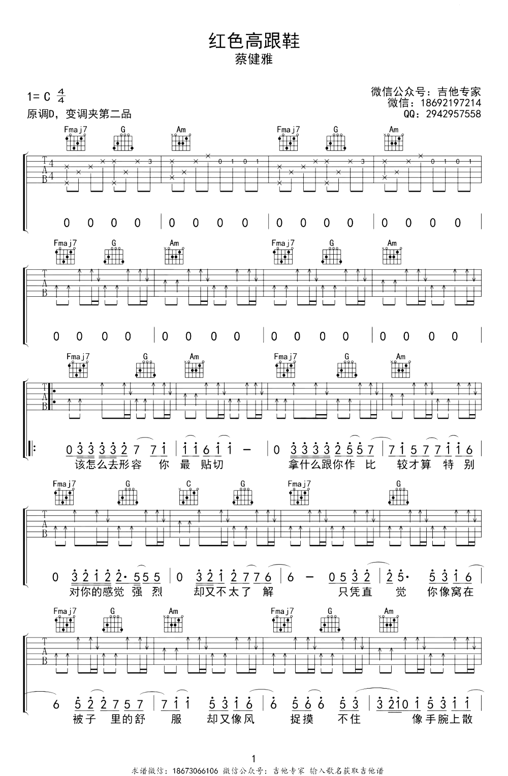红色高跟鞋吉他图片谱,蔡健雅演唱的一首经典情歌。三个和弦一看就会。《红色高跟鞋》吉他弹唱谱,选用原调C调指法编配,一共两张图片吉他图片谱。 这首歌此谱整体难点不大,演奏时要留意节奏的准确性,扫弦的强弱,演奏时留意节奏,多加练习即可。慵懒温暖的声线,歌词和旋律完美结合,更是让人听来有种回味无穷的感觉,喜欢这首歌的琴友们练习起来吧。