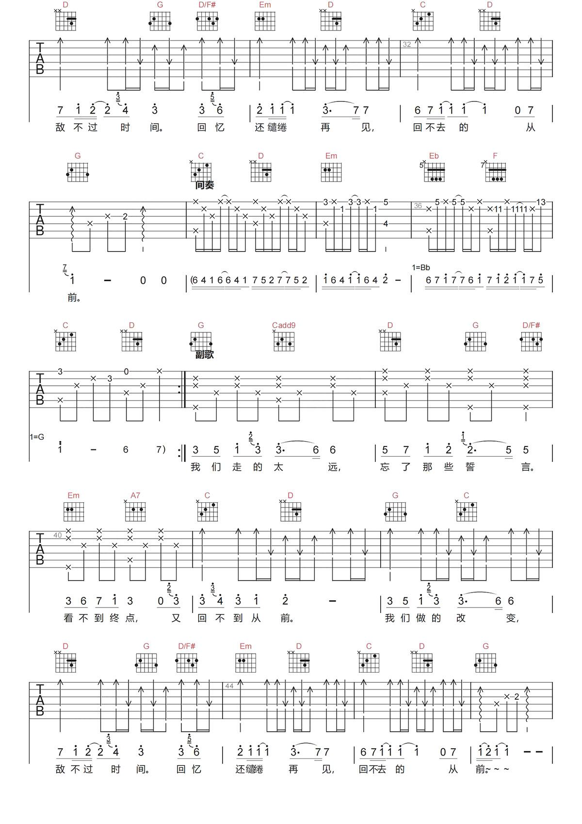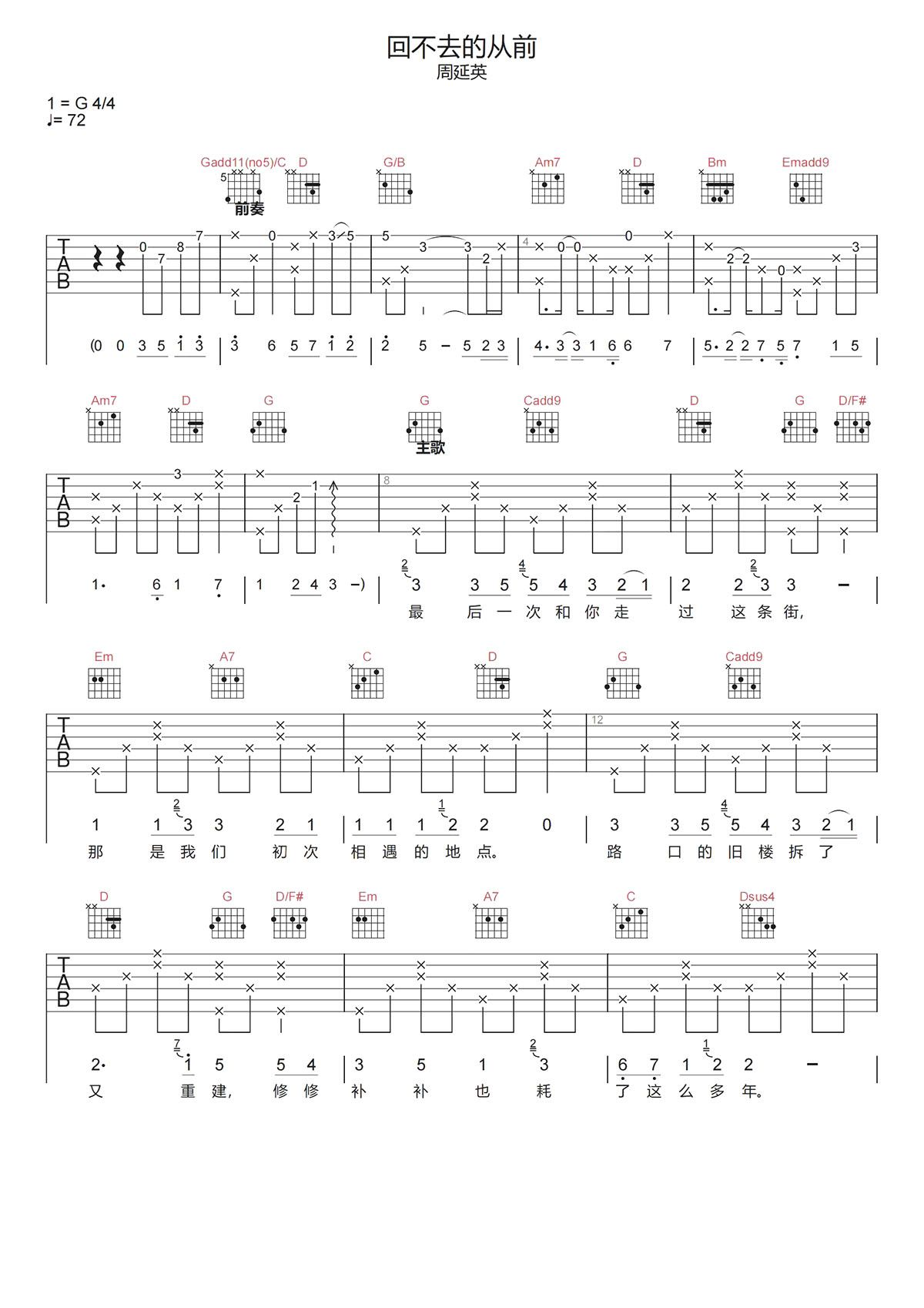周延英《回不去的从前》原版吉他谱 G调