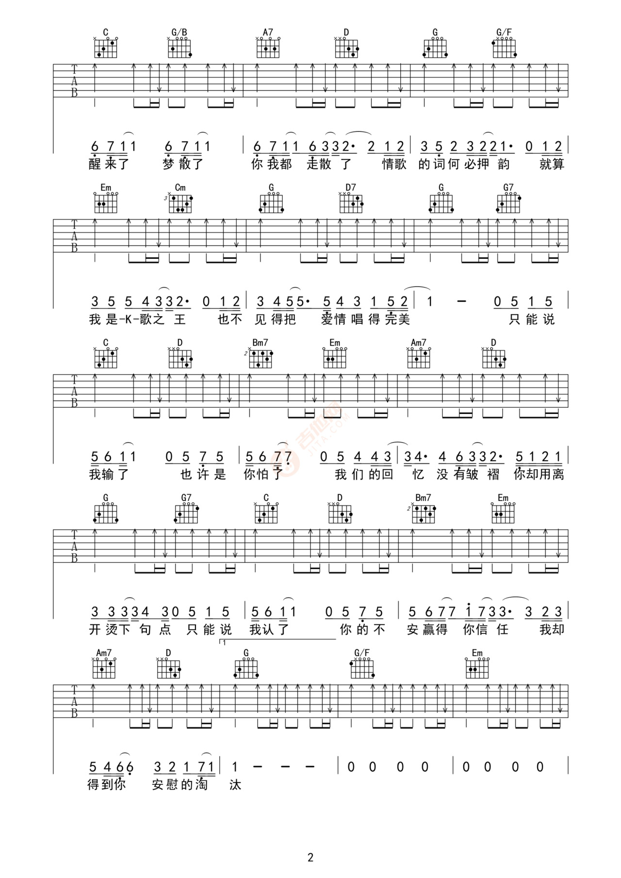 4/4 拍,速度约 72BPM,变调夹 0 品,中级难度(Capo 1 可贴近原调)。核心和弦 G、Em、C、D,副歌加 Am、Bm7 丰富和声。主歌用轻柔分解(低音 + 323,轻切音),突出叙事感;副歌扫弦(下 下上 上下上)配重拍强调,贴合伤感情绪。左手和弦转换流畅,右手力度分层,演唱气息沉稳,尾奏渐弱收束,精准还原歌曲的无奈与深情。