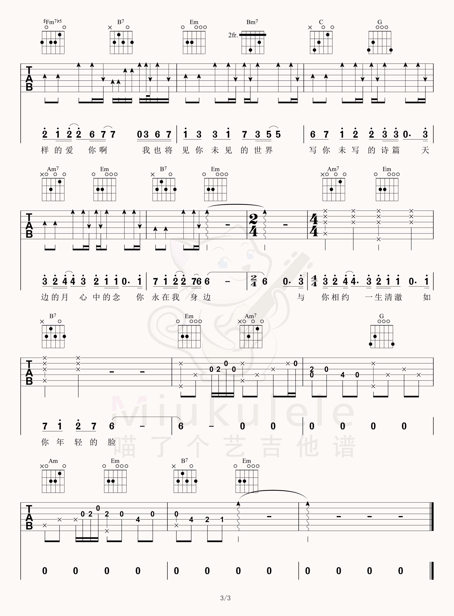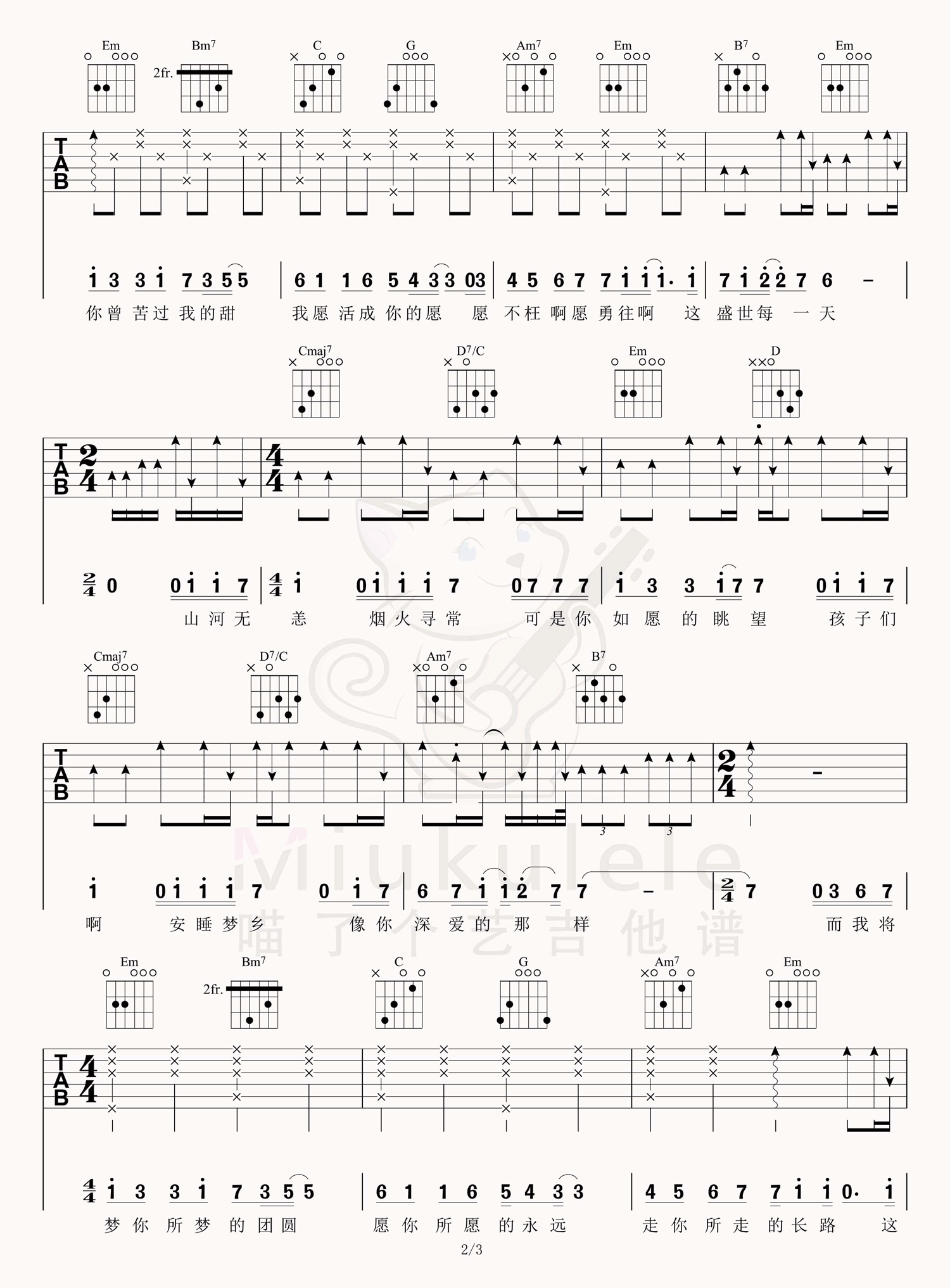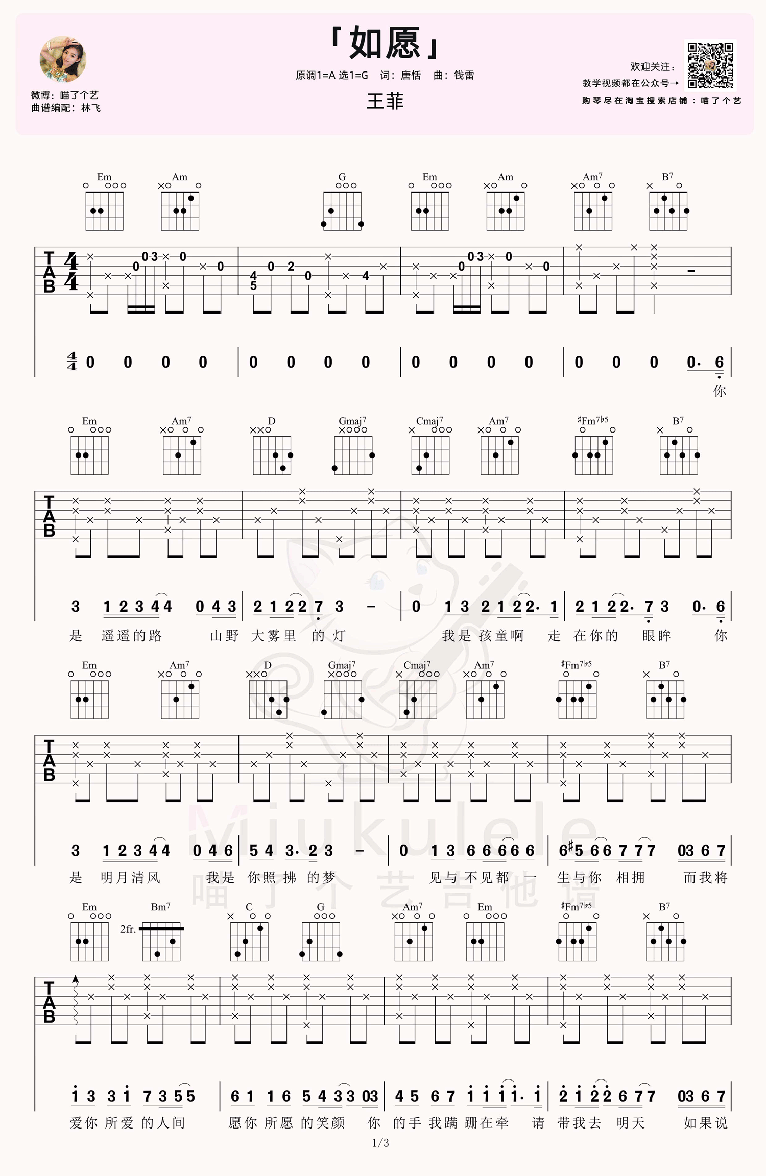 如愿吉他谱,王菲演唱的一首歌曲,4/4拍的节奏,这首歌曲的原调为A调,这里曲谱采用了G调指法进行编配,演唱时夹变调夹2品可回到原调,也可根据个人实际嗓音情况选择。曲谱由酷琴谱更新上传,共3张高清图片弹唱吉他谱例,来源于@喵了个艺编配出品。这首歌每一句都是在表达对父辈们的思念和追忆,非常走心,王菲的歌声配上电影,真是相得益彰。