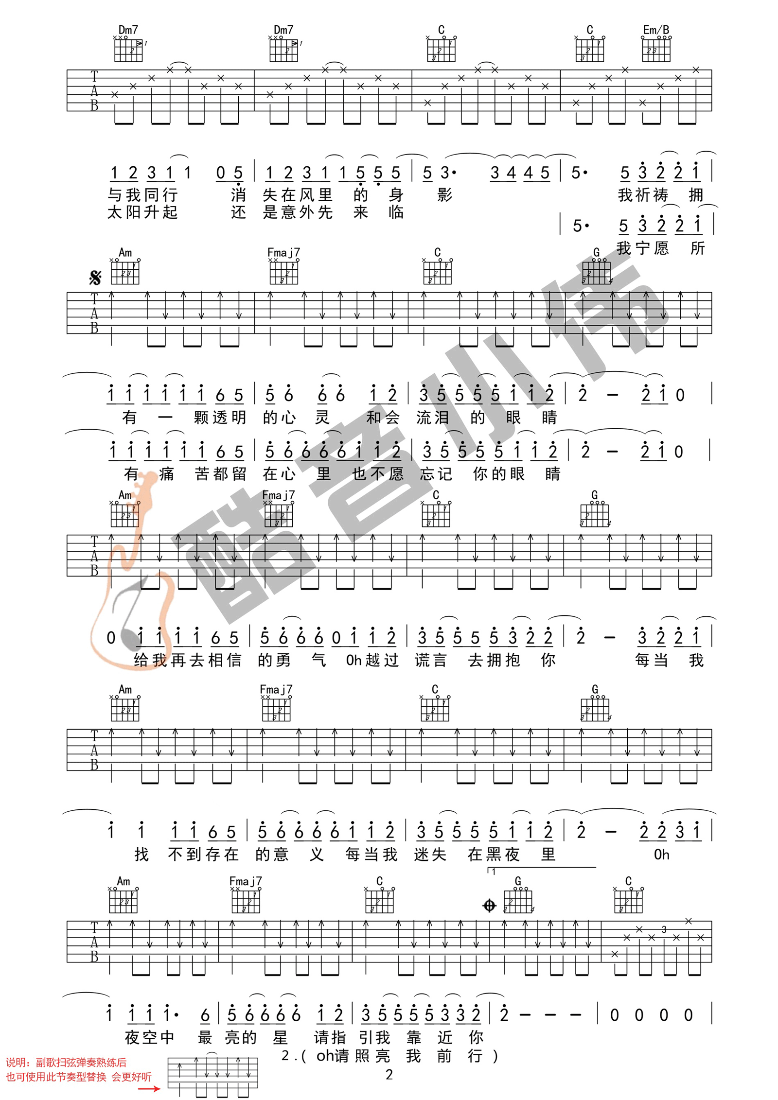 夜空中最亮的星吉他谱,逃跑计划演唱的一首歌曲,4/4拍的节奏,这首歌曲的原调为B调,这里曲谱采用了C调指法进行编配,演唱时可根据个人情况选择变调夹,曲谱由酷琴谱更新上传,共3张高清图片弹唱吉他谱例,来源于@酷音小伟编配出品。这个版本的谱子编配的比较简单,C调指法这个调式比较适合女生的嗓音,当然男生要弹这个版本,可以选择降半音调弦,但是不建议,最好是选择G调版本去弹,毕竟原曲也比较高。