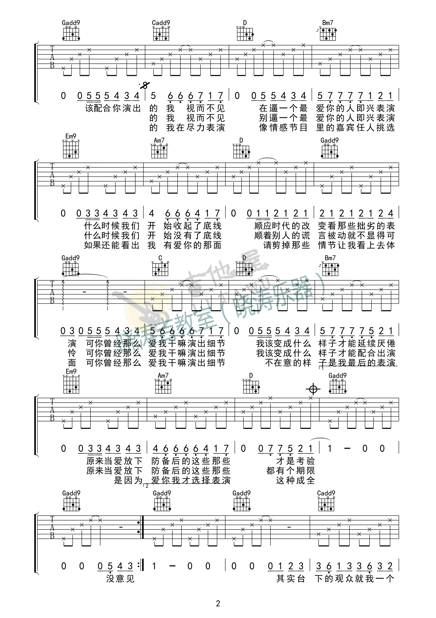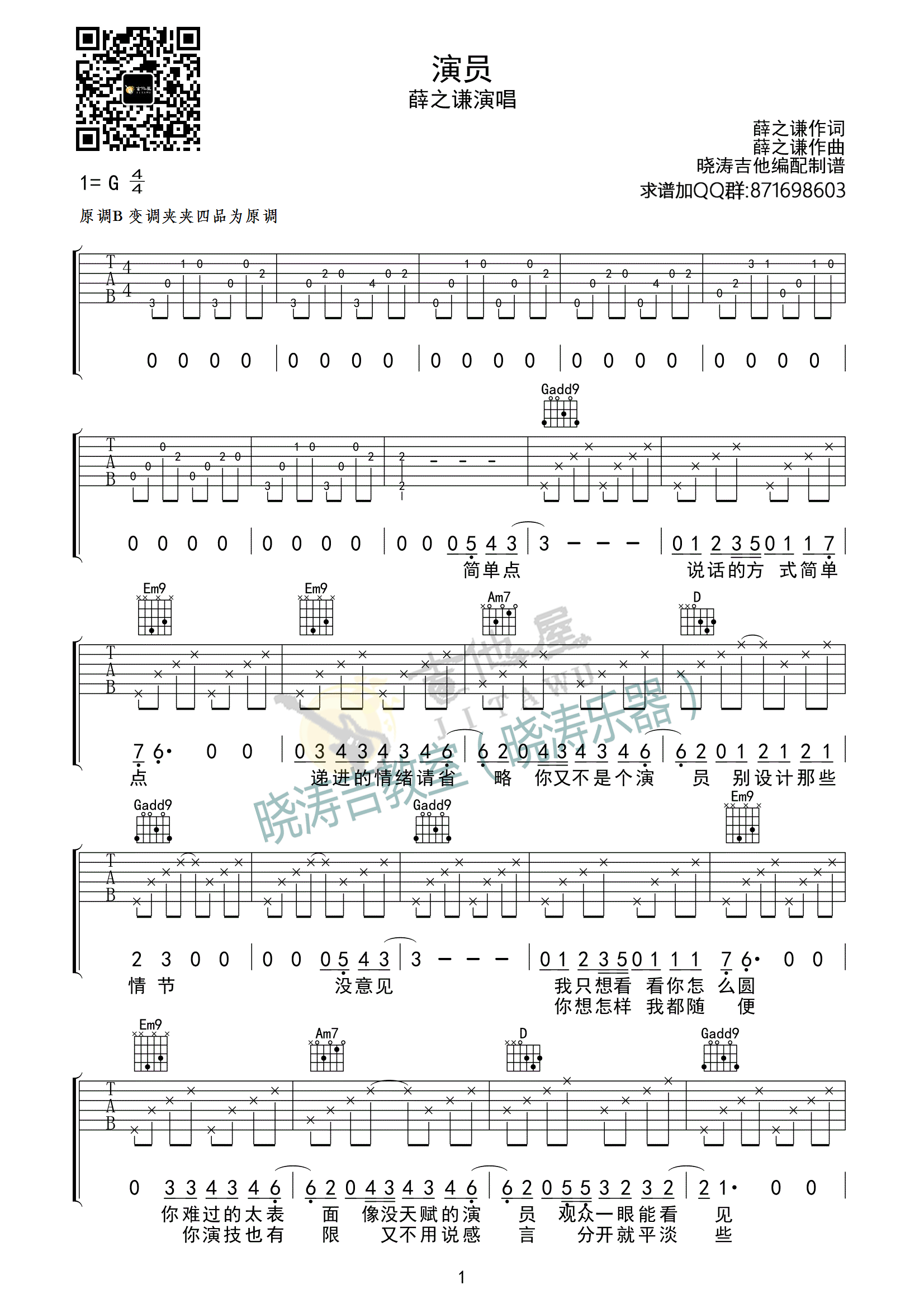 演员吉他谱,薛之谦演唱的一首歌曲,4/4拍的节奏,这首歌曲的原调为B调,这里曲谱采用了G调指法进行编配,演唱时夹变调夹4品可回到原调,也可根据个人实际嗓音情况选择。曲谱由酷琴谱更新上传,共3张高清图片弹唱吉他谱例,来源于@晓涛吉他编配出品。薛之谦的一首经典歌曲,这里编配难度适中,节奏型很简单。