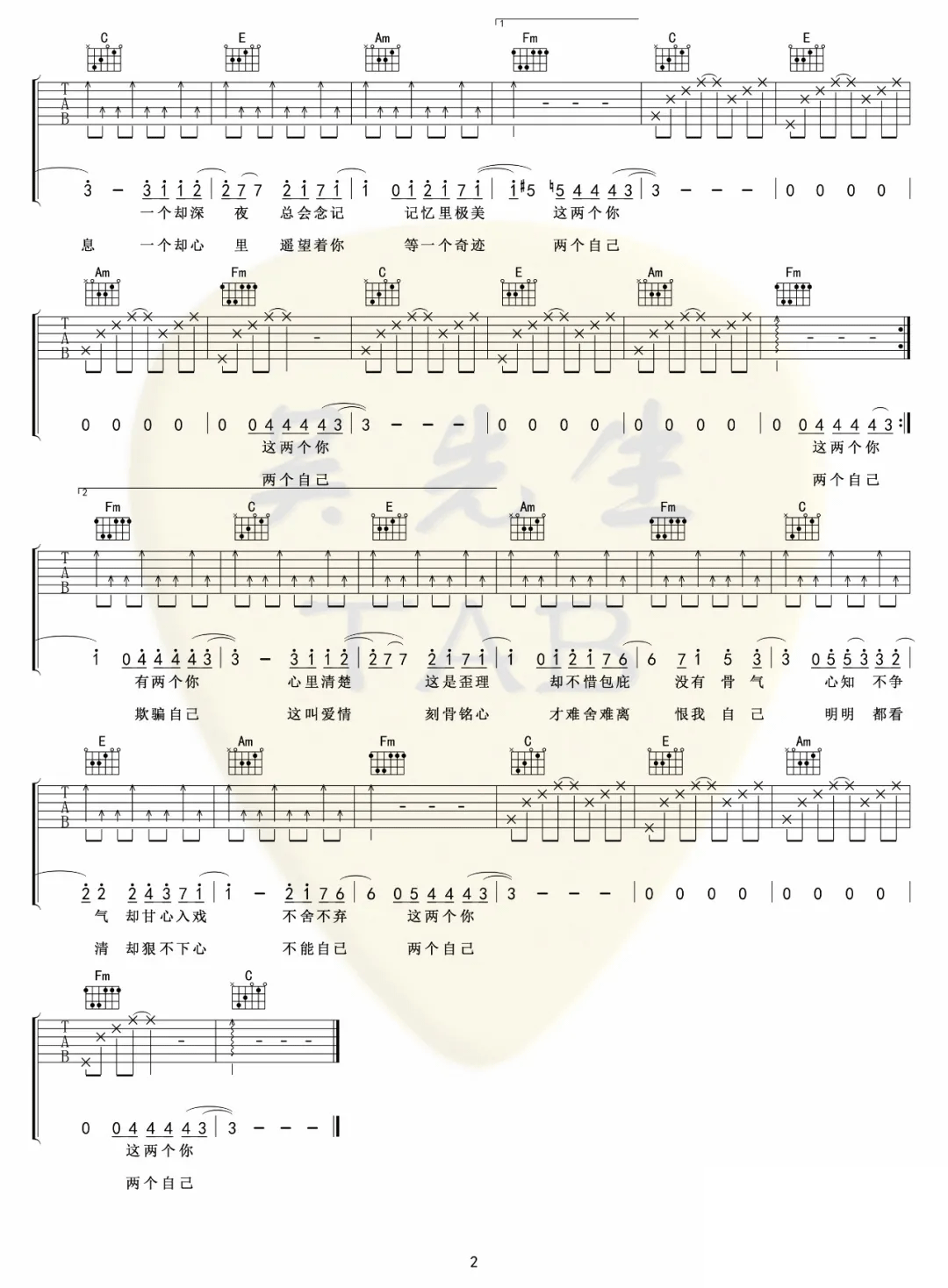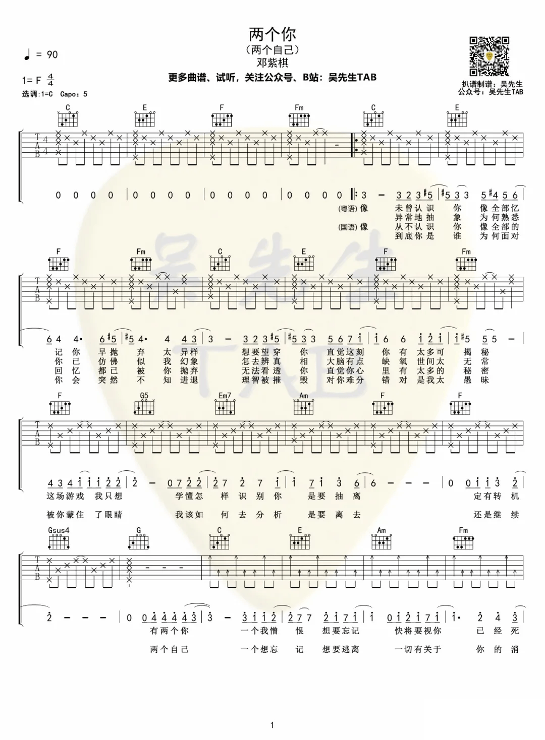 两个你吉他谱,邓紫棋演唱的一首歌曲,4/4拍的节奏,这首歌曲的原调为F调,这里曲谱采用了C调指法进行编配,演唱时夹变调夹5品可回到原调,也可根据个人实际嗓音情况选择。曲谱由酷琴谱更新上传,共2张高清图片弹唱吉他谱例,来源于@吴先生TAB编配出品。邓紫棋新出的一首歌曲,国语《两个自己》,粤语《两个你》,只有歌词不一样,旋律蛮好听的。