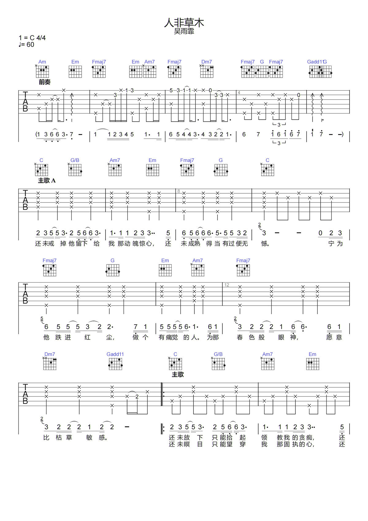 《人非草木》是吴雨霏演唱的歌曲,由林夕作词 C调吉他谱