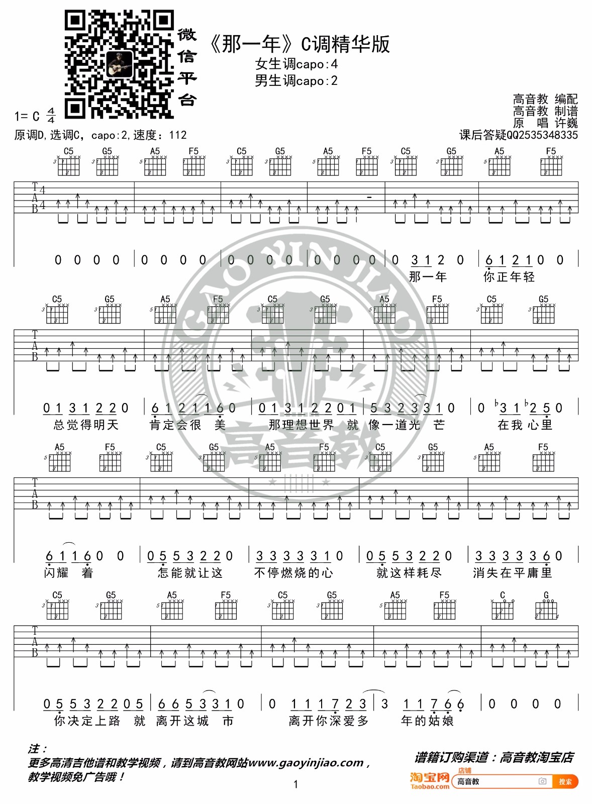 那一年吉他谱,许巍演唱的一首歌曲,4/4拍的节奏,这首歌曲的原调为D调,这里曲谱采用了C调指法进行编配,演唱时夹变调夹2品可回到原调,也可根据个人实际嗓音情况选择。曲谱由酷琴谱更新上传,共3张高清图片弹唱吉他谱例,来源于@高音教编配出品。很经典的一首歌,在弹奏时需要注意扫弦的层次,前奏部分闷音扫弦是全曲的灵魂,多体会五和弦的魅力。