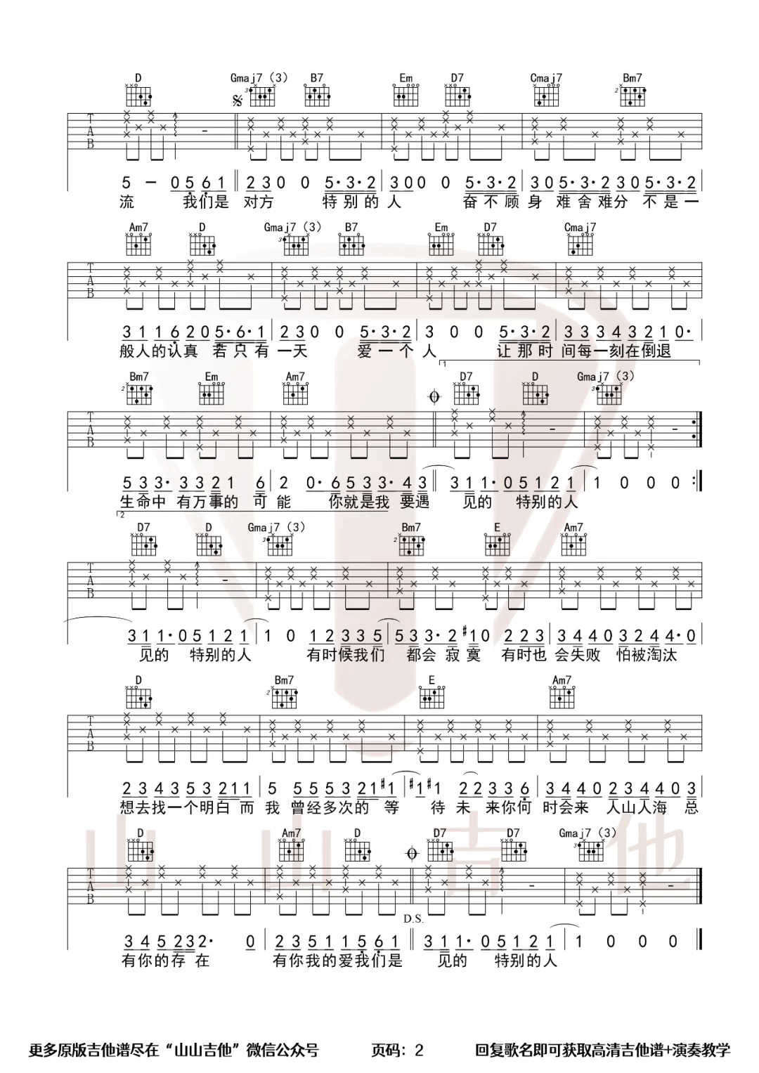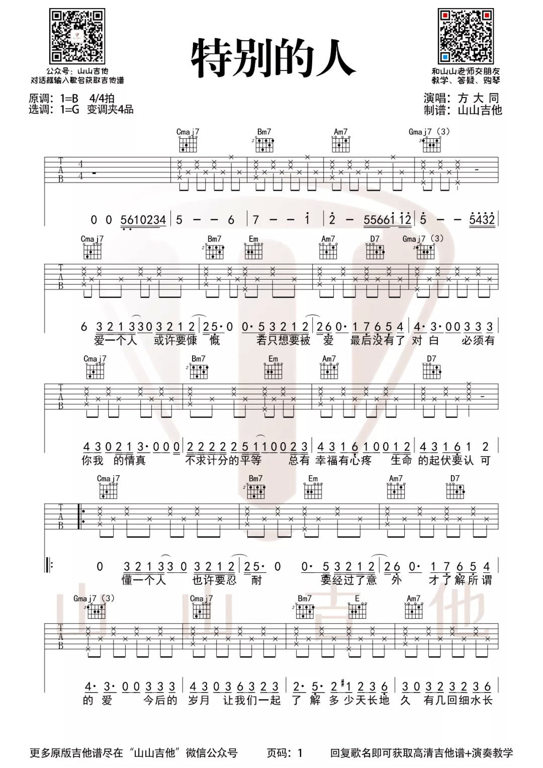 特别的人吉他谱,方大同演唱的一首歌曲,4/4拍的节奏,这首歌曲的原调为B调,这里曲谱采用了G调指法进行编配,演唱时夹变调夹4品可回到原调,也可根据个人实际嗓音情况选择。曲谱由酷琴谱更新上传,共2张高清图片弹唱吉他谱例,来源于@山山吉他编配出品。