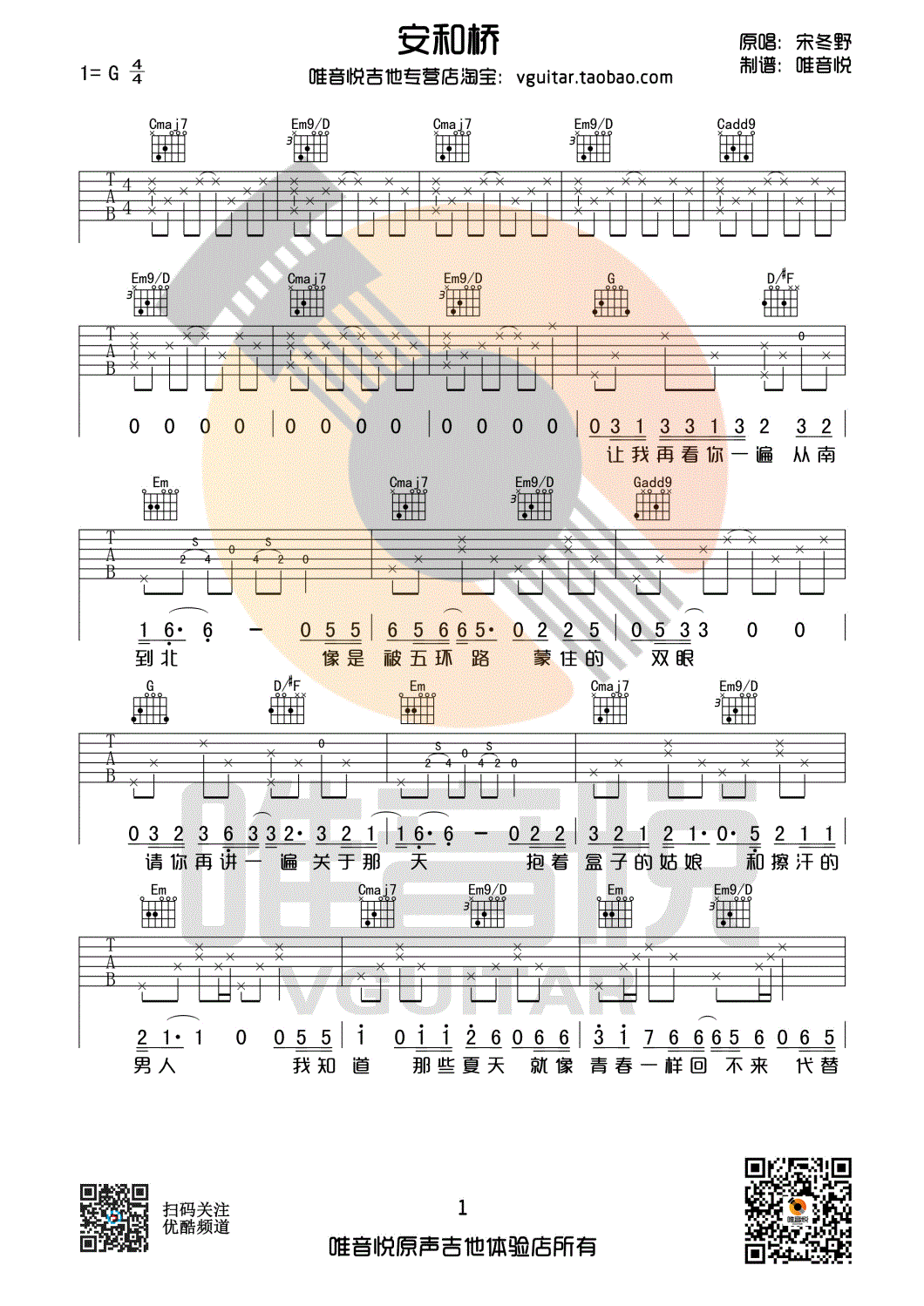 吉他弹唱教学 宋冬野《安和桥》G调 吉他谱