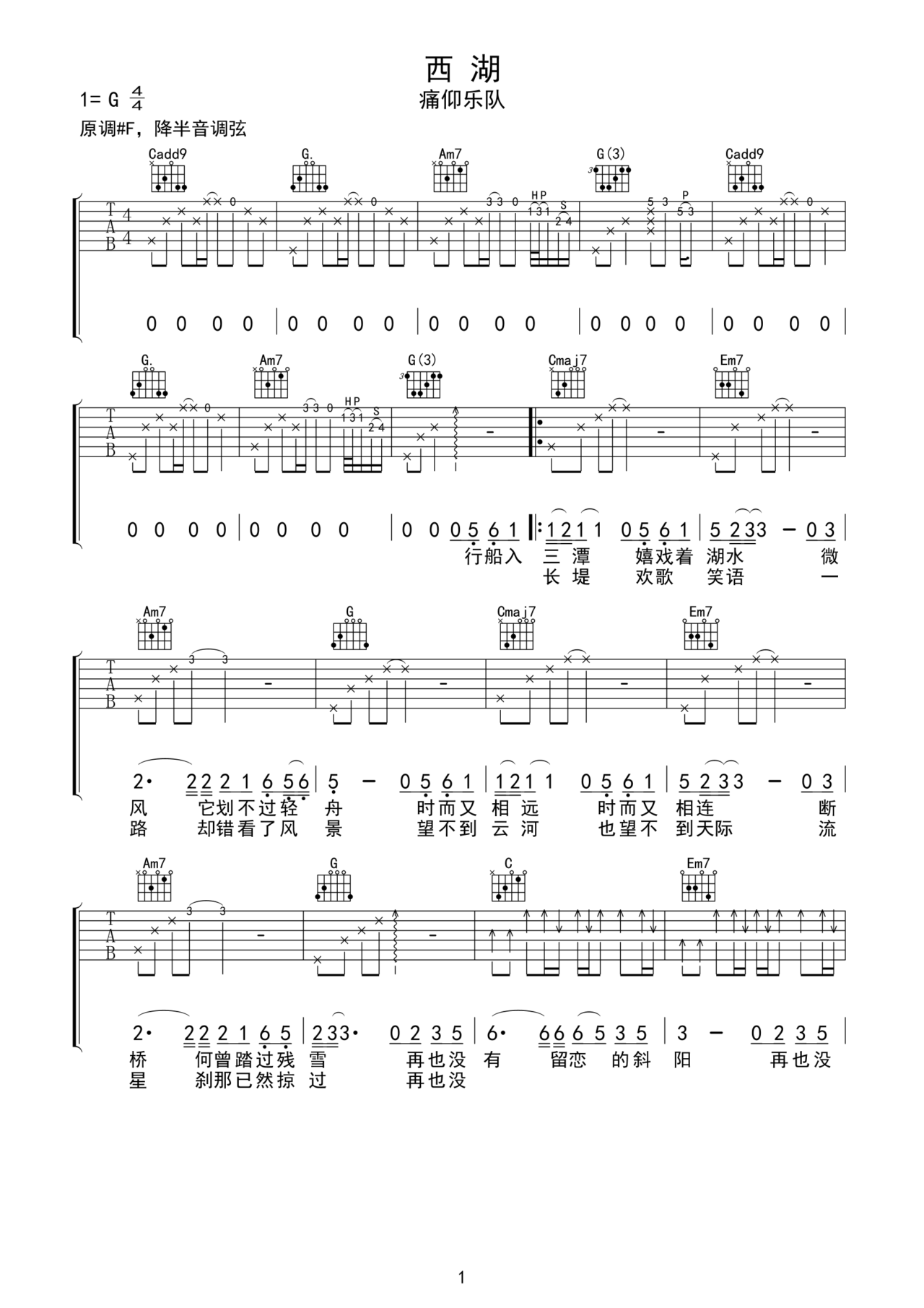痛仰乐队《西湖》G调原版 吉他谱