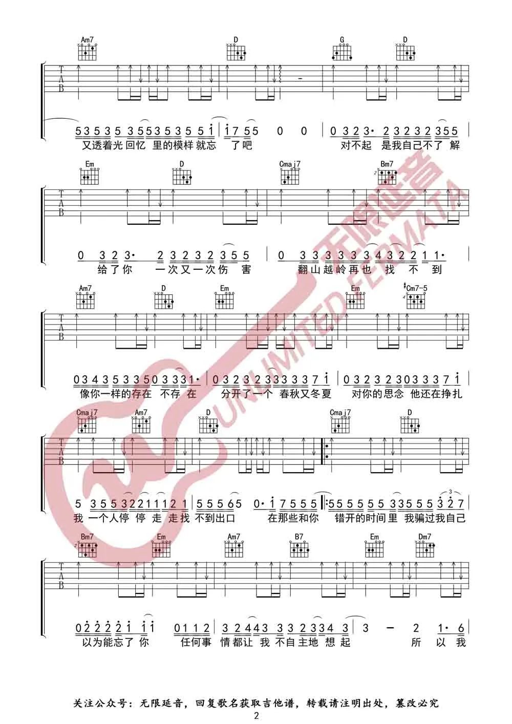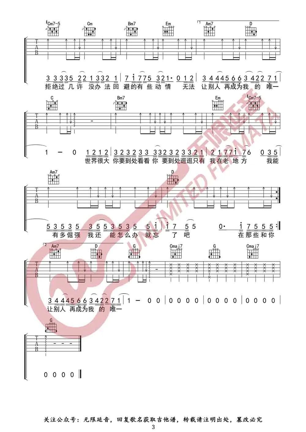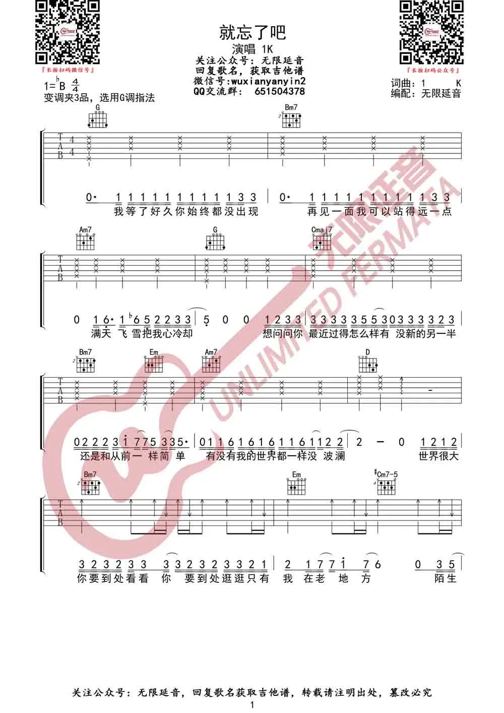 《就忘了》1K G调原版 吉他谱,这首歌曲的原调为降B调,这里曲谱采用了G调指法进行编配,演唱时夹变调夹3品可回到原调,也可根据个人实际嗓音情况选择。来源于@无限延音编配出品。