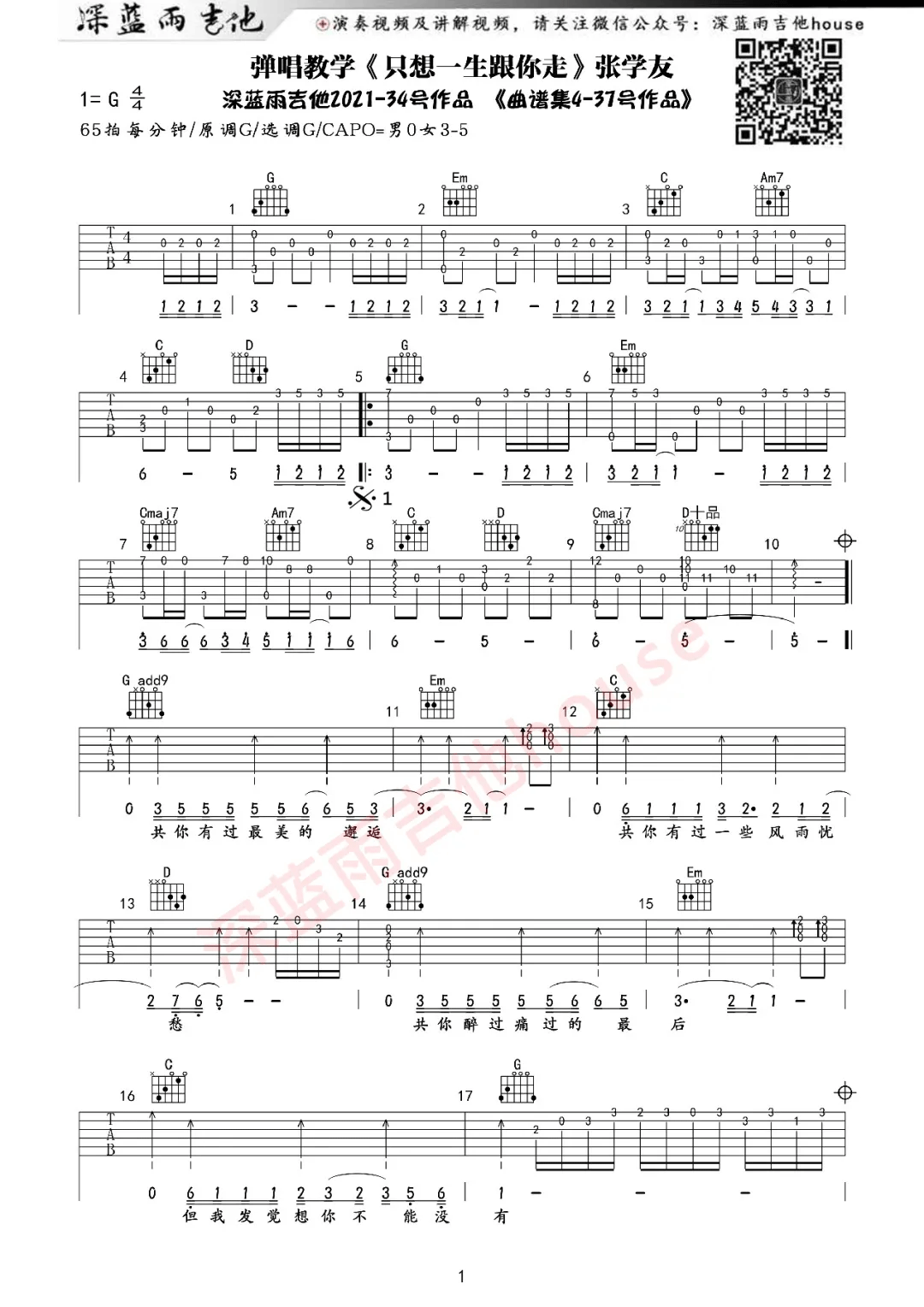 《只想一生跟你走》是张学友演唱的一首歌曲,4/4拍的节奏,这首歌曲的原调为G调,这里曲谱采用了G调指法进行编配,演唱时可不夹变调夹,来源于@深蓝雨吉他编配出品。