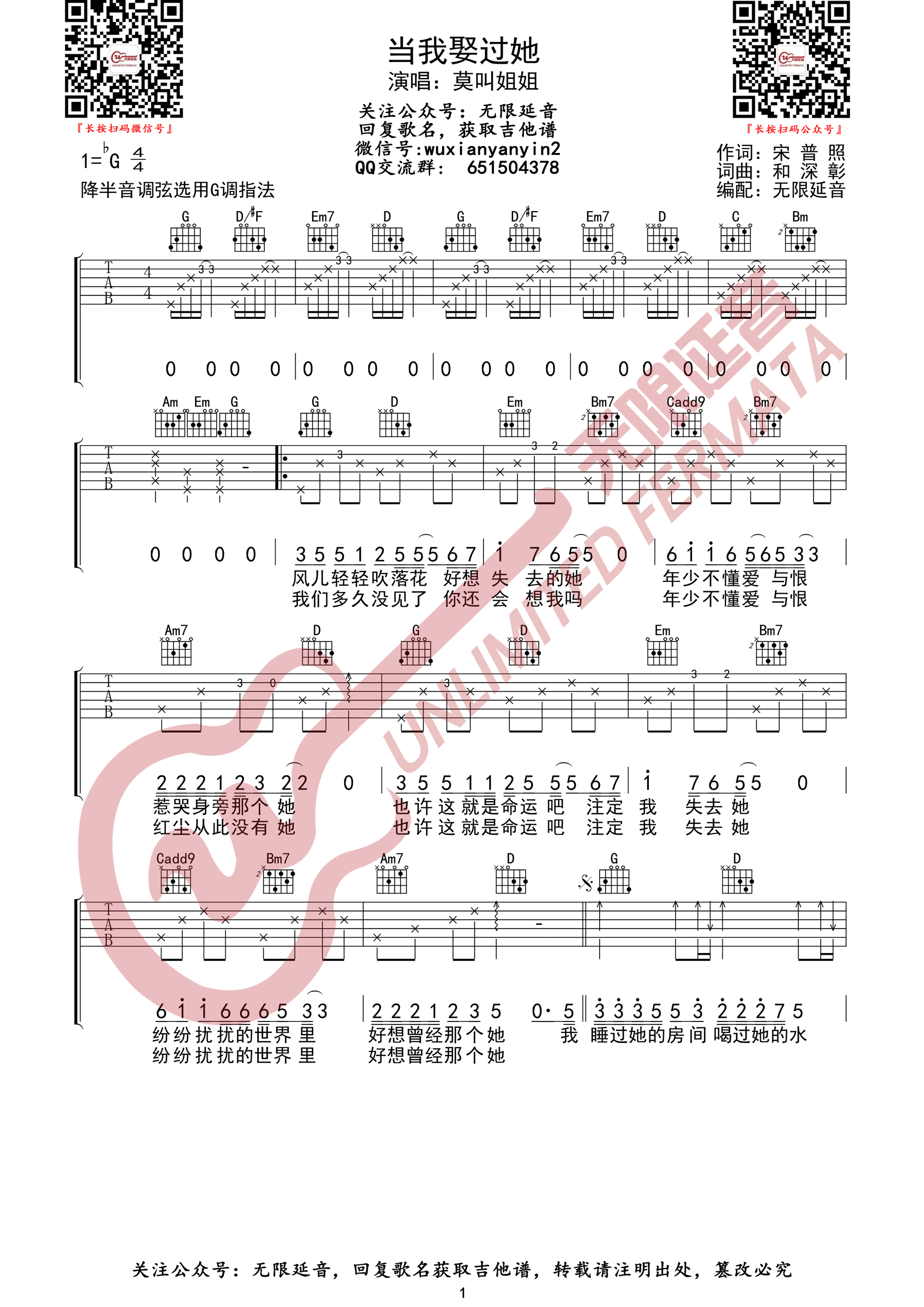 《当我娶过她》莫叫姐姐 G调原版 吉他弹唱谱