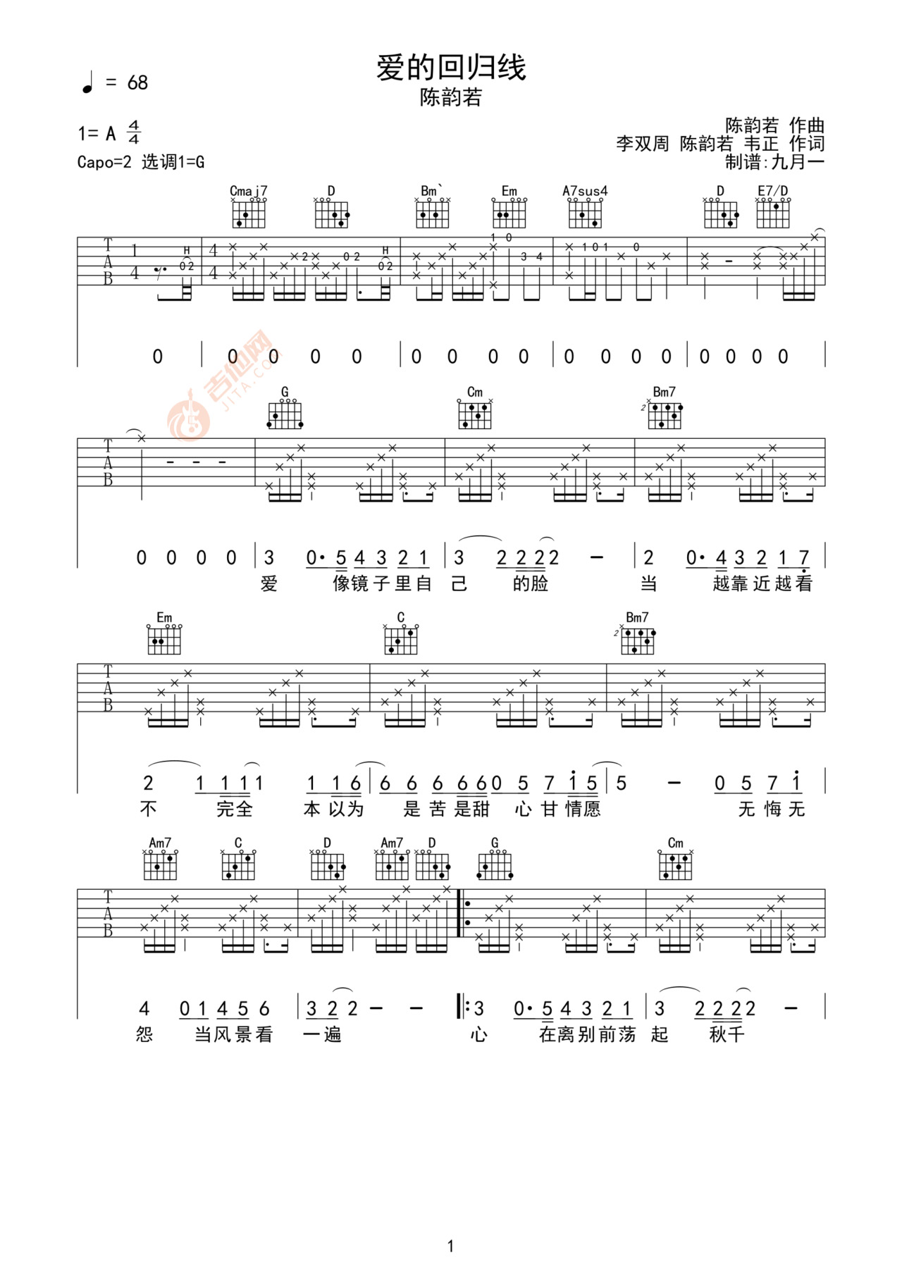 《爱的回归线》陈韵若/陈每文 G调 吉他弹唱谱